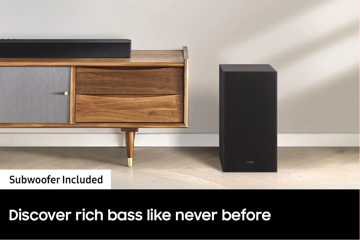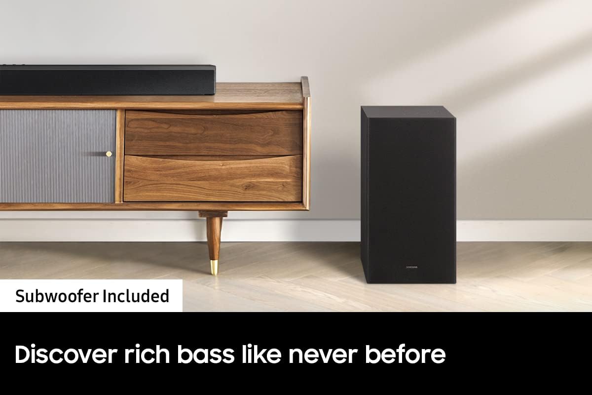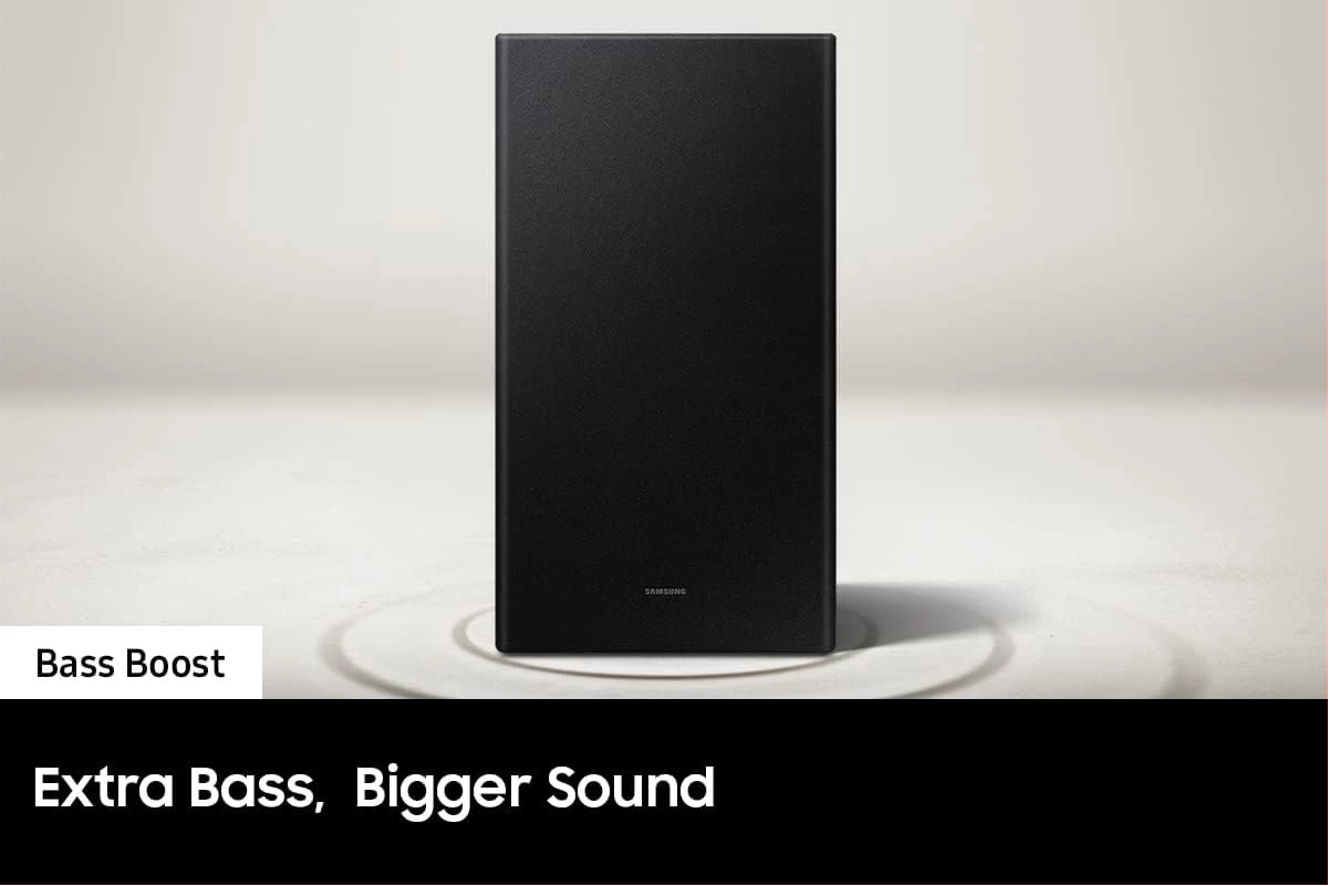 SAMSUNG HW-B650 3.1ch Soundbar w/Dolby 5.1 DTS Virtual:X, Bass Boosted, Built-in Center Speaker, Bluetooth Multi Connection, Voice Enhance & Night Mode, Subwoofer Included. Elevate your experience with 3D surround sound and built in center speaker Key Features: SAMSUNG HW-B650 3.1ch Soundbar. DOLBY DIGITAL 5.1 DTS VIRTUAL:X: Multi-directional sound draws you into the action with Dolby Digital 5.1 capable and DTS Virtual X.Waterproof: No BASS BOOST: Boost the bass with a touch of a button. BUILT-IN CENTER SPEAKER: The built-in center speaker delivers enhanced dialogue so you won’t miss a word. SUBWOOFER INCLUDED: Experience the intensity of action movies with the powerful bass coming from the included subwoofer. ADAPTIVE SOUND LITE: Enjoy optimized audio with enhanced voice clarity on all your favorite video content.