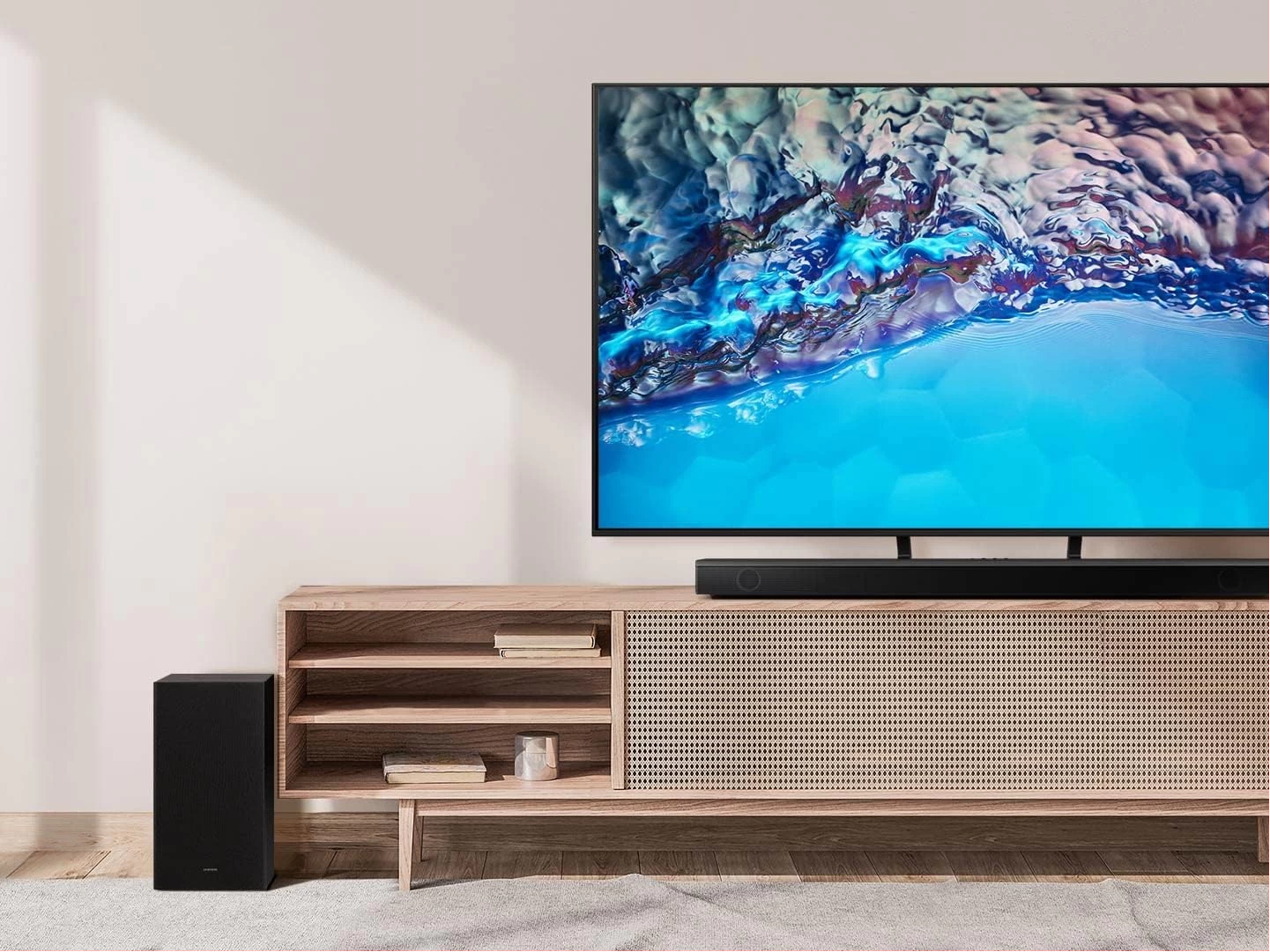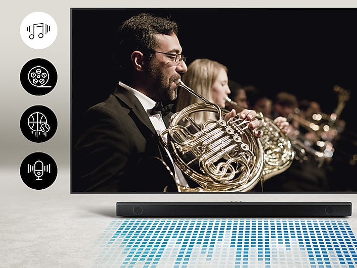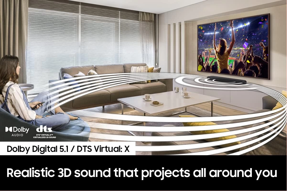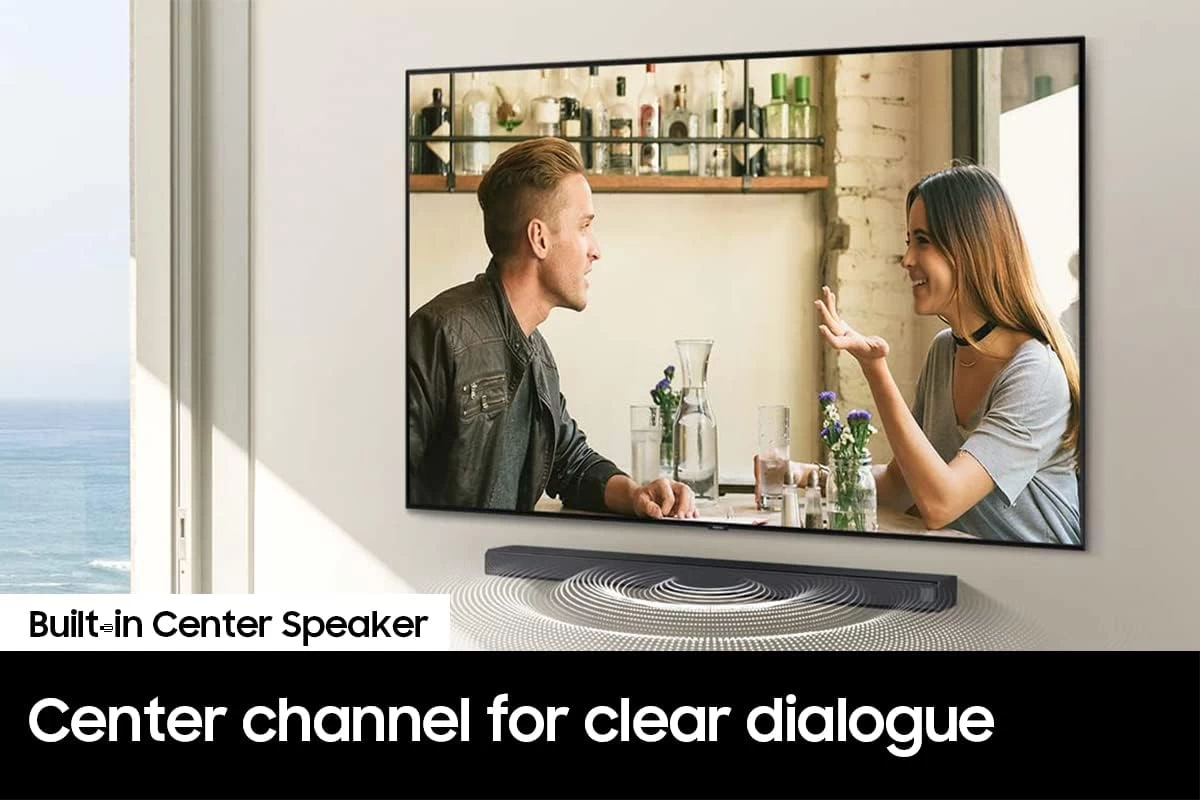 SAMSUNG HW-B650 3.1ch Soundbar w/Dolby 5.1 DTS Virtual:X, Bass Boosted, Built-in Center Speaker, Bluetooth Multi Connection, Voice Enhance & Night Mode, Subwoofer Included. Elevate your experience with 3D surround sound and built in center speaker Key Features: SAMSUNG HW-B650 3.1ch Soundbar. DOLBY DIGITAL 5.1 DTS VIRTUAL:X: Multi-directional sound draws you into the action with Dolby Digital 5.1 capable and DTS Virtual X.Waterproof: No BASS BOOST: Boost the bass with a touch of a button. BUILT-IN CENTER SPEAKER: The built-in center speaker delivers enhanced dialogue so you won’t miss a word. SUBWOOFER INCLUDED: Experience the intensity of action movies with the powerful bass coming from the included subwoofer. ADAPTIVE SOUND LITE: Enjoy optimized audio with enhanced voice clarity on all your favorite video content.