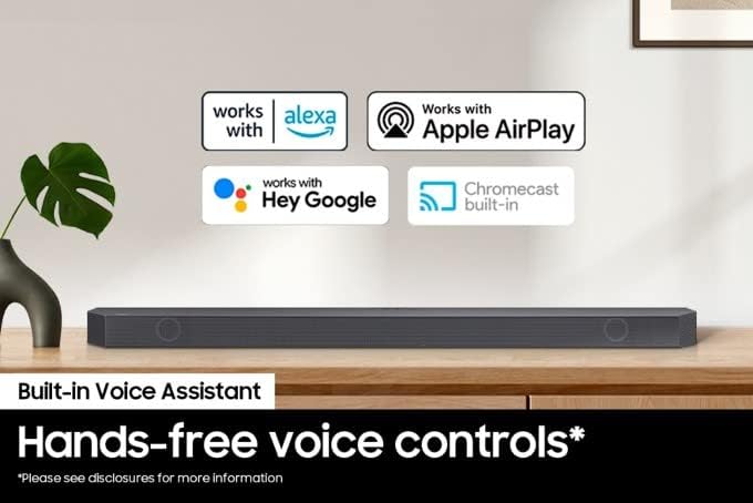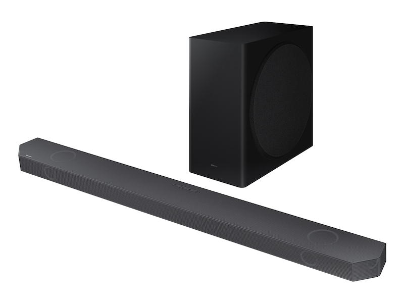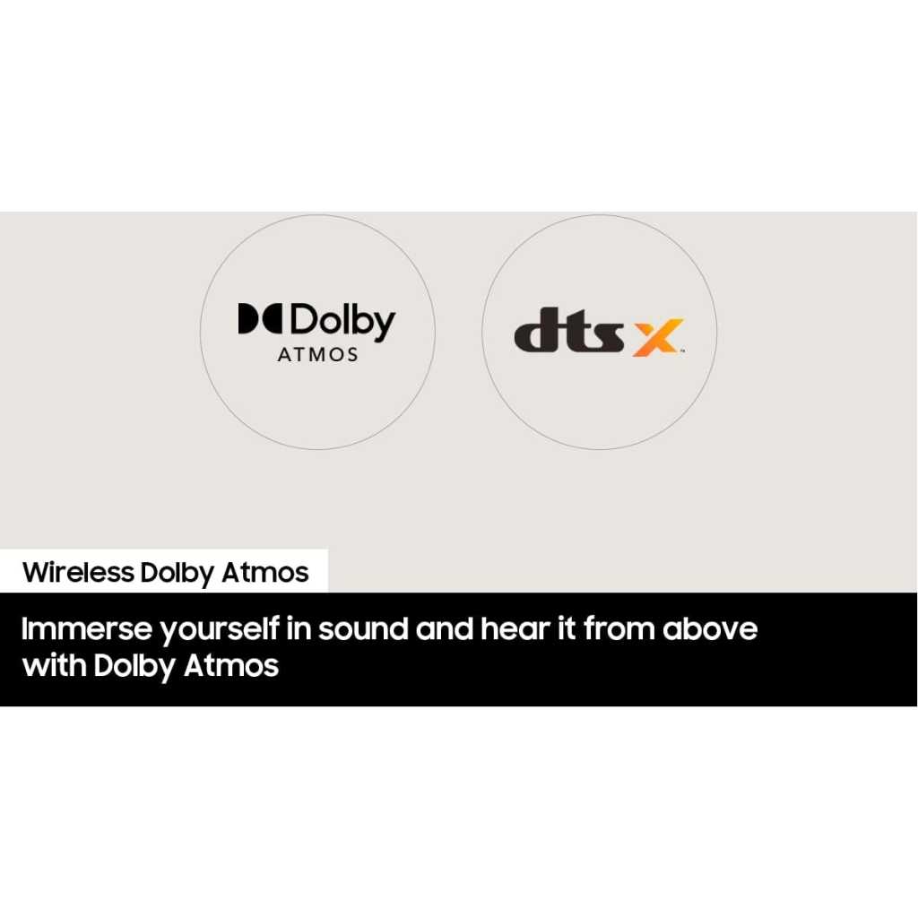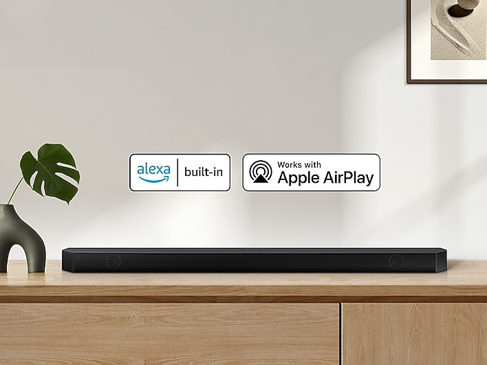 Sound comes alive with the Q800B soundbar without the need for HDMI cables thanks to Wireless Dolby Atmos. 5 channels, 1 subwoofer and 2 channels combine to create sound effects as the director intended with immersive acoustic technology. The Q800B also synchronizes with all of the speakers from your compatible Samsung TV to create rich, multi-layered audio with Q-Symphony. Sound is automatically optimized to fit their surroundings with SpaceFit Sound. Plus, you can even play music, hear the forecast, and customize content via voice commands to Alexa with Built-In Voice Assistant. Play your music, videos or podcasts from your mobile device to your soundbar with a simple tap.****** Hear dialogue and commentary loud and clear when it counts the most and never miss an important moment. Active Voice Analyzer breaks down room noise so that onscreen voices are always optimized, making movies and sports more enjoyable. *Q-Symphony is compatible with select 2020 – 2022 Samsung TVs. Please refer to samsung.com for more information. Soundbar must be connected to TV via HDMI to enable Q-Symphony function. **SpaceFit Sound built-in. Please refer to samsung.com for more information. ***Content Services may vary by region & are subject to change without notification. Amazon, Alexa, and all related logos are trademarks of Amazon.com, Inc. or its affiliates. ****This Samsung Soundbar supports AirPlay2 and requires iOS 11.4 or later. Apple, and AirPlay are trademarks of Apple Inc., registered in the U.S. and other countries. *****Compatible with select TVs and select gaming consoles (e.g. Xbox X, PS5). Game console sold separately. ******Tap sound is only compatible with select Samsung mobile devices, with Android 8.1 and above. Tap Sound requires SmartThings app to activate and set up. This service only works when Soundbar and mobile are on. Ultimate sound immersion with side firing speakers