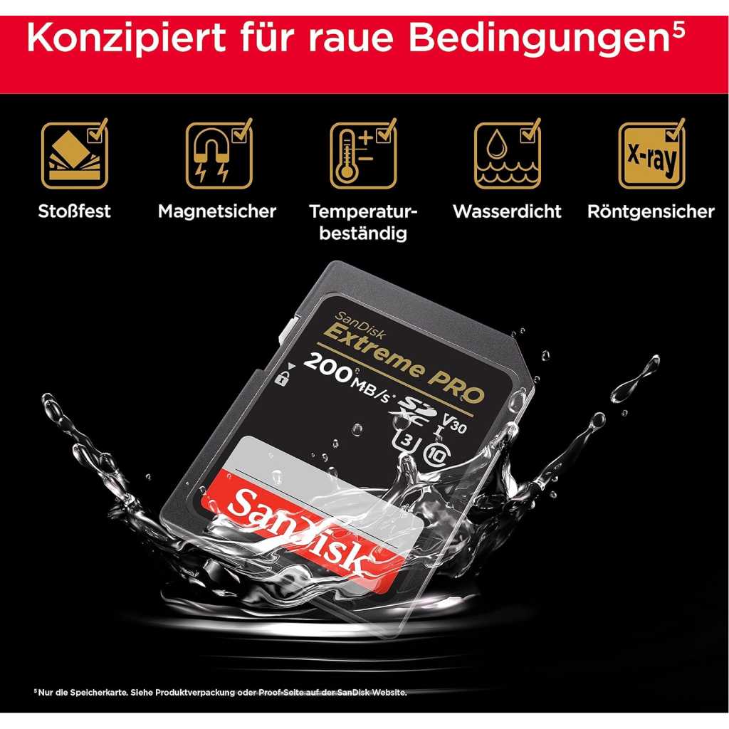 Box contents: SanDisk Extreme PRO SDXC UHS-I memory card 256 GB (V30, transfer speed 200 MB / s, U3, 4K UHD videos, SanDisk QuickFlow technology, temperature resistant) Make lossless 4 K UHD video recordings thanks to UHS Speed Class 3 (U3) and Video Speed Class 30 (V30) with the SD card for camera Professional performance for fast recording and 4K UHD videos with the SanDisk memory card; included is 2 years of use of the RescuePRO Deluxe software to restore accidentally deleted images Thanks to the SanDisk QuickFlow technology and fast transfer of up to 200 MB/s, you no longer wait for your files to be transferred to your SD card or from the SD card to the computer The SDXC memory card is designed for extreme conditions and is before temperature-resistant, waterproof, shockproof and X-ray proof Key Features: Box contents: SanDisk Extreme PRO SDXC UHS-I memory card 256 GB (V30, transfer speed 200 MB / s, U3, 4K UHD videos, SanDisk QuickFlow technology, temperature resistant) Make lossless 4 K UHD video recordings thanks to UHS Speed Class 3 (U3) and Video Speed Class 30 (V30) with the SD card for camera Professional performance for fast recording and 4K UHD videos with the SanDisk memory card; included is 2 years of use of the RescuePRO Deluxe software to restore accidentally deleted images Thanks to the SanDisk QuickFlow technology and fast transfer of up to 200 MB/s, you no longer wait for your files to be transferred to your SD card or from the SD card to the computer The SDXC memory card is designed for extreme conditions and is before temperature-resistant, waterproof, shockproof and X-ray proof