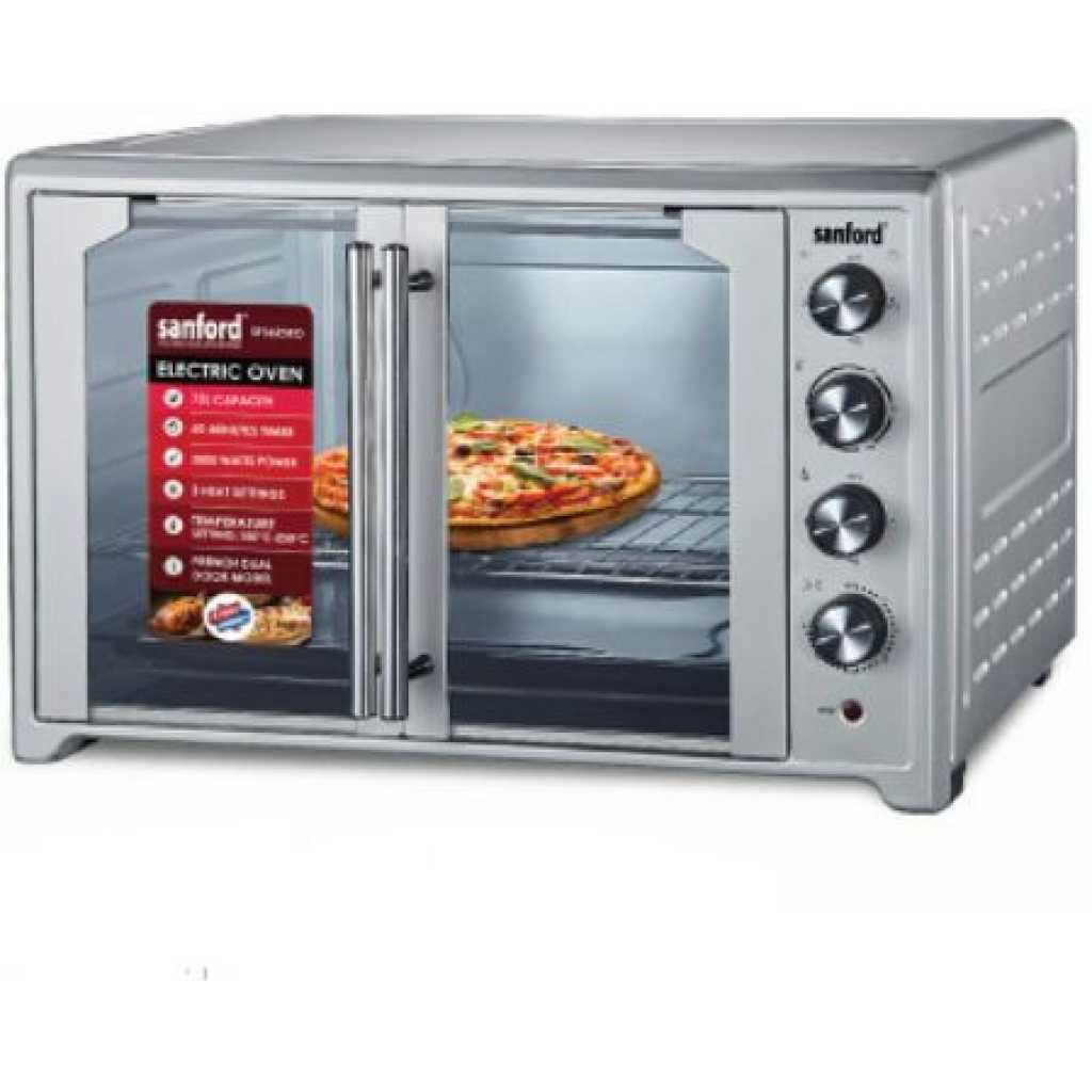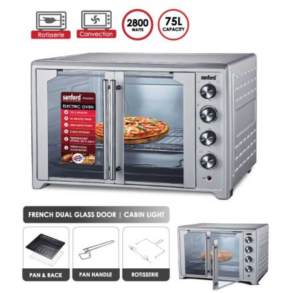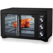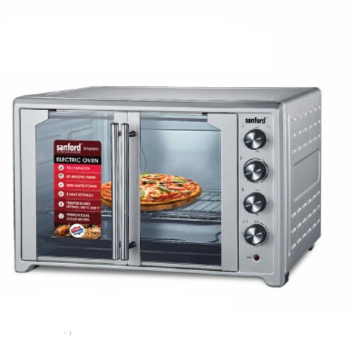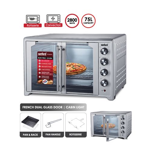 Sanford 75 Litres Double Glass Door Electric Oven Grill Toaster – Grey Meat can be skewered on the pit, and cooked on this horizontal rotisserie. After using the rotisserie pit for grilling, the hot rod can be removed from the oven using this handle. It’s commonly used for baking and roasting. The oven is equipped with 2 hot plates on top for multi-purpose cooking. The oven can heat from the top to provide broiling and grilling. It also provides an integrated rotisserie. The rotation cooks the meat evenly on its own juices and allows easy access for continuous self-basting. Accessories: Baking tray, Wire rack, Tray handle Grill handle, Key Features: Sanford 75 Litres Double Glass Door Electric Oven Grill Toaster – Grey 60 minutes timer with bell ring Adjustable thermostat 4stages heating Heat-resistant glass window 100-250 Degree Oven power: Top 650 W+ bottom 800 W Hotplate power: 1000 W + 1500 W Total operation power: 2950 W Black Body Inox Panel 75 Litres interior volume One rectangular enameled tray and one round enameled tray Cr-Ni grill 4 levels of tray height Long-lasting stainless Cr-Ni resistance