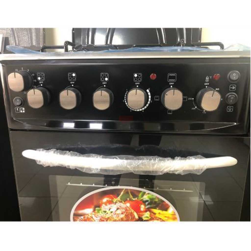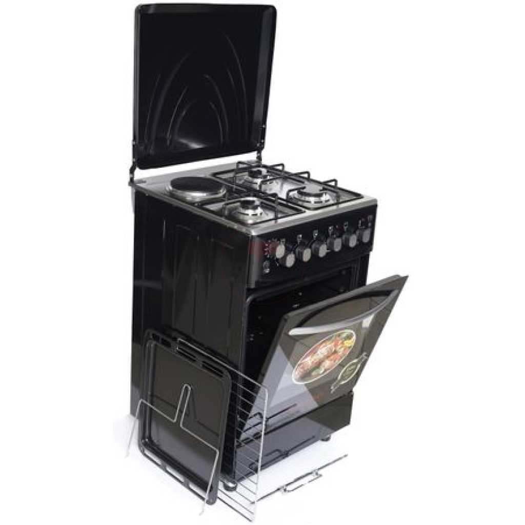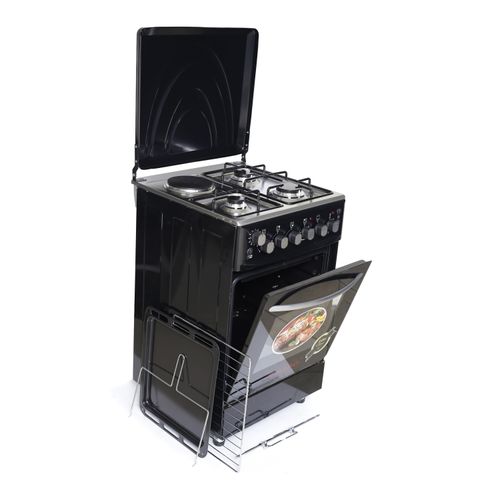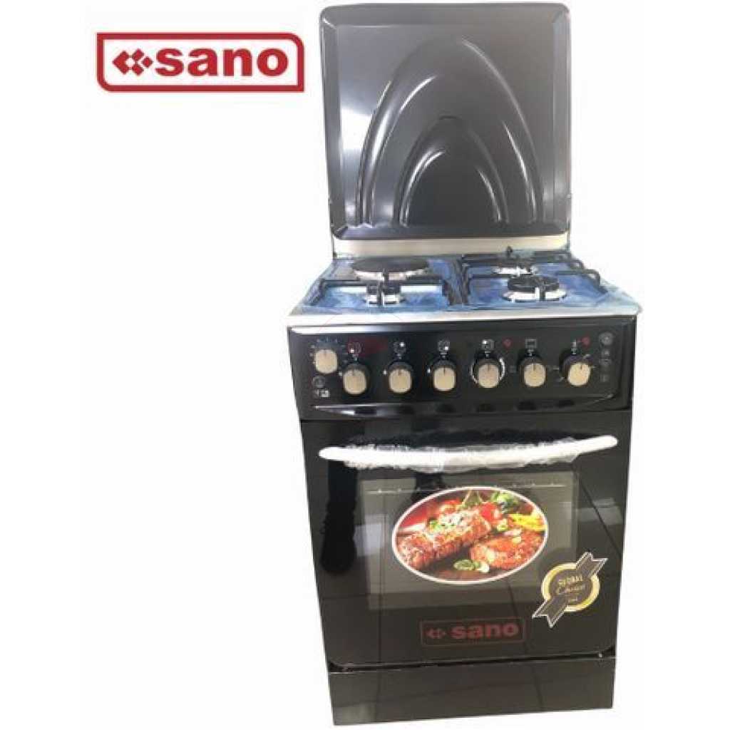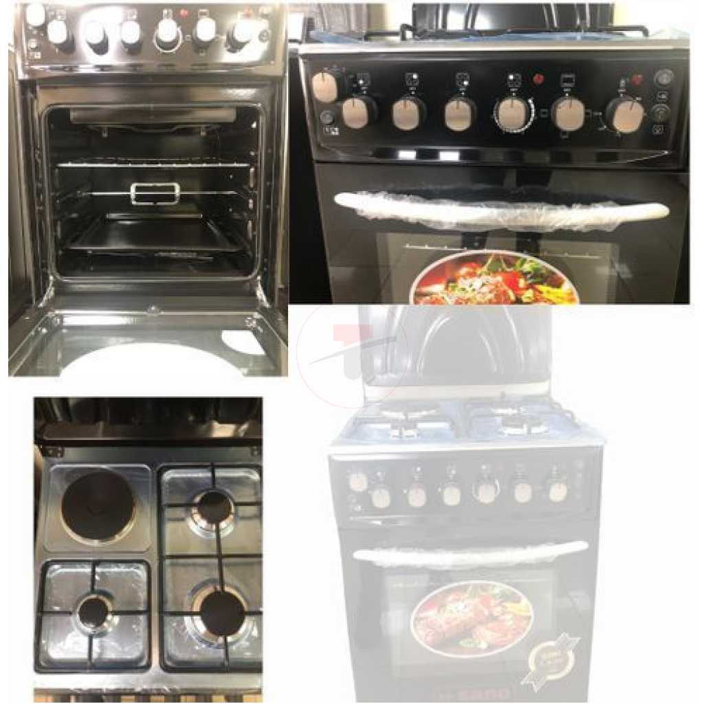 Key Features: Sano 55X55 3 Gas 1 Electric Cooker; Electric Oven & Grill, Rotisserie, Auto Ignition, Timer, 2 Oven Trays – Black. 3 gas burners 1 Hot plate Rotisserie Double electric oven Timer Ignition Oven Lamp Temperature control Double glass oven door Adjustable stands Grill 2 oven trays Stainless steel top and body Black 2 YEARS GUARANTEE AND 3 YEARS WARRANTY.