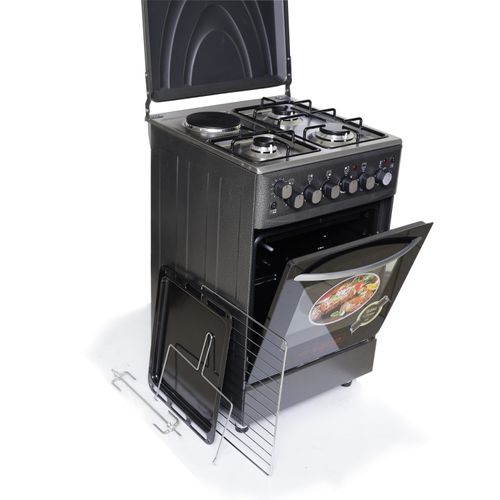Key Features: Sano Cooker 55X55 3 Gas 1 Electric With Rotisserie, Electric Oven & Grill, Automatic Ignition – Brown. 3 gas burners 1 Hot plate Rotisserie Double electric oven Timer Ignition Oven Lamp Temperature control Double glass oven door Adjustable stands Grill 2 oven trays Stainless steel top and body Fireworks brown Easy clean 2 YEARS GUARANTEE AND 3 YEARS WARRANTY.
