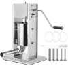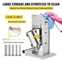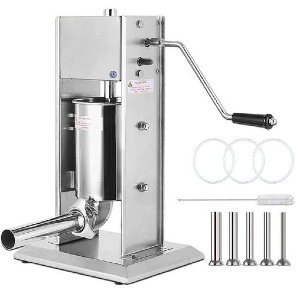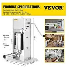 Ceny Sausage Filler Machine 10L Stainless Steel Sausage Maker Vertical Manual two Speed The Stainless Steel sausage filler is good choice for commercial and household useThe sausage filler is widely used in kitchens, restaurants and many food processing places. The sausage maker includes a metal piston with an air release valve to reduce air from flowing into casings and meat bags. An effortless tool for both beginners and professionals.Cylinder thickness: 1.2mm, much thicker than other 0.8mm cylinder. It ensures longer lifespan, fully complied with hygienic standard. Body thickness: 2mm, much stronger than other 1mm body construction.Product Features:The two manual speed(slow/fast) offers a easier way to make sausageSausage filler is 90 degrees tilted barrel designed for easy refilling; vertical design for counter top space savingA stainless steel and stable cylinder; quick removable barrel design for easy cleaning4 stainless steel stuffing funnels of varying sizes: 0.63inch/16mm, 0.87inch/22mm, 1.26inch/32mm and 1.5inch/38mmCylinder thickness:1.2mm;body thickness:2mm, much stronger than other machineItem specs:Item Weight:22lbProduct Dimensions:11 x 9 X 19 inchesMaterial:stainless steelPackage Content:1x Manual Sausage Stuffer1x Hand Crank1x Locking Nut4x Stuffing Tubes4x Rubber Feet1x User Manual