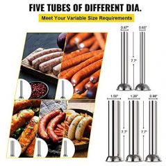 Key Features: Sausage machine equip with 4 stainless steel stuffing funnels of varying sizes: 0.63inch/16mm, 0.87inch/22mm, 1.26inch/32mm and 1.5inch/38mm Cylinder thickness:1.2mm;body thickness:2mm, much stronger than other machine The two manual speed(slow/fast) offers a easier way to make sausage Sausage filler is 90 degrees tilted barrel designed for easy refilling;vertical design saves counter top space A stainless steel, stable cylinder and quick removable barrel design for easy cleaning