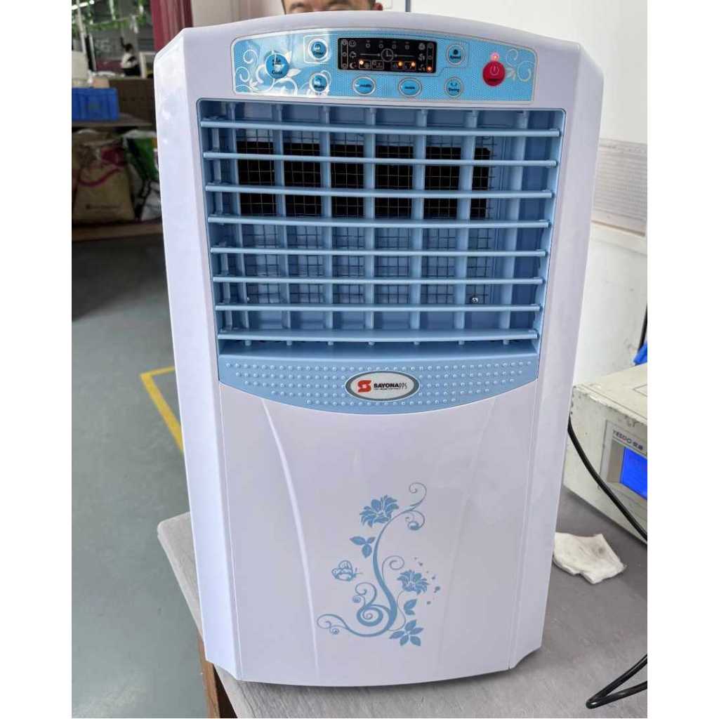 Key Features: Sayona SAC-204 Portable Air Cooler w/ 7 Liter Water Tank, 2 Ice Boxes, Three Wind Speeds, Water Level Indicator, 4 Castor Wheels, Electronic Display, 12 Hour Timer | Home Appliance. Sleek Design: The Sayona Air Cooler features a white, blue and grey exterior and a sleek design that can fit into any corner of your house. Its international style delivers quality performance all day long. Heavy-Duty Built: Equipped with motorized louvers and a high-speed motor, this air cooler delivers consistent cooling in all corners with a left-to-right auto-swing function. Made with quality components, it offers lasting durability. Multi-functional: This room cooler features 2 ice chambers that add ice to the water to make the pads cooler, resulting in cool air passing through them. One can easily move it around with its 4 castor wheels. Electronic Display: This air cooler features an electronic display with electronic buttons and functions to allow you to control your air-cooling settings with ease. It is equipped with low, medium & high wind speeds and natural, sleep, and normal modes. Product Specifications: Sayona 7L Air Cooler comes with a remote for easy use and operates on AC 220-240V of power. Its honeycomb pad absorbs heat from the air causing the water to evaporate, so keep an eye on the water level indicator to keep the water tank full and clean.