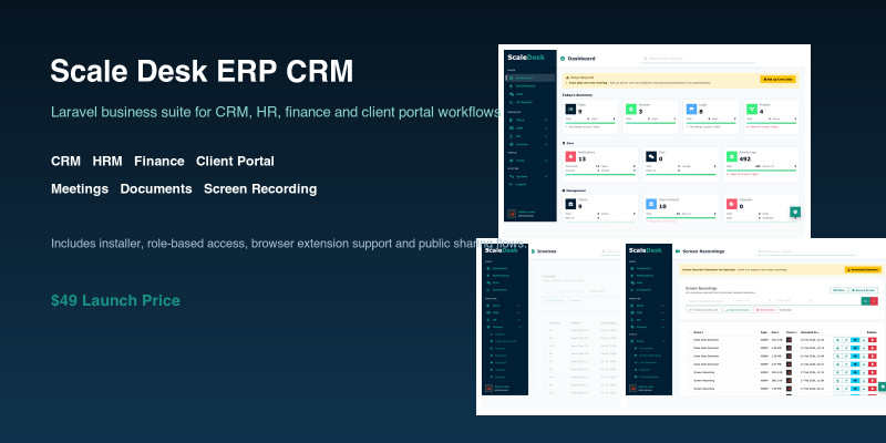 Scale Desk ERP CRM for Laravel. Laravel ERP CRM with HR, finance, client portal, meetings, documents, recordings, screenshots, and browser extension support.