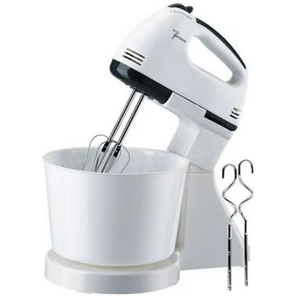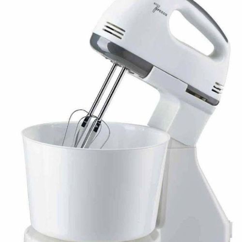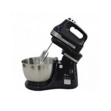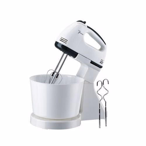 Key Features: Egg beater and dough hook Operating voltage: 220-240 volts 7 Adjustable Speed for mixture texture control Detachable to use as Hand Mixer Snap-On Tilt Stand Base Double Snap-On Chrome Dough Hooks & 4-Blade Egg Beater 1.7LNon-rotating Stainless Steel Bowl 2-Pin compatible plug 180-watt motor 7 speeds; heel rest design Dual-function hand mixer and stand mixer Material: Plastic+Stainless Steel