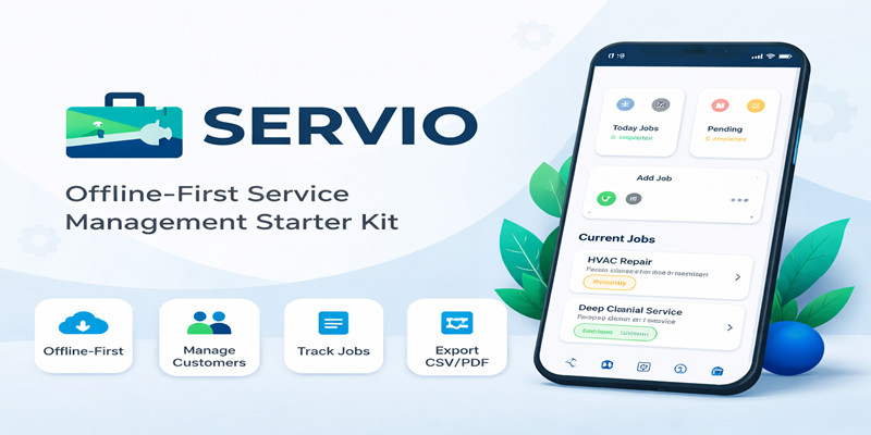Servio – Offline Booking Service Kit - Flutter. Offline-first Flutter starter kit for service & booking apps with job workflow, customers, export, and custom status managemen