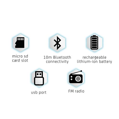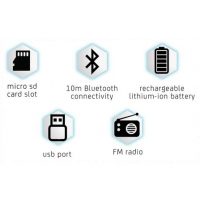 Key Features: Rechargeable lithium-ion batte 10m Bluetooth range – No wires FM radio – Tune in, turn up None