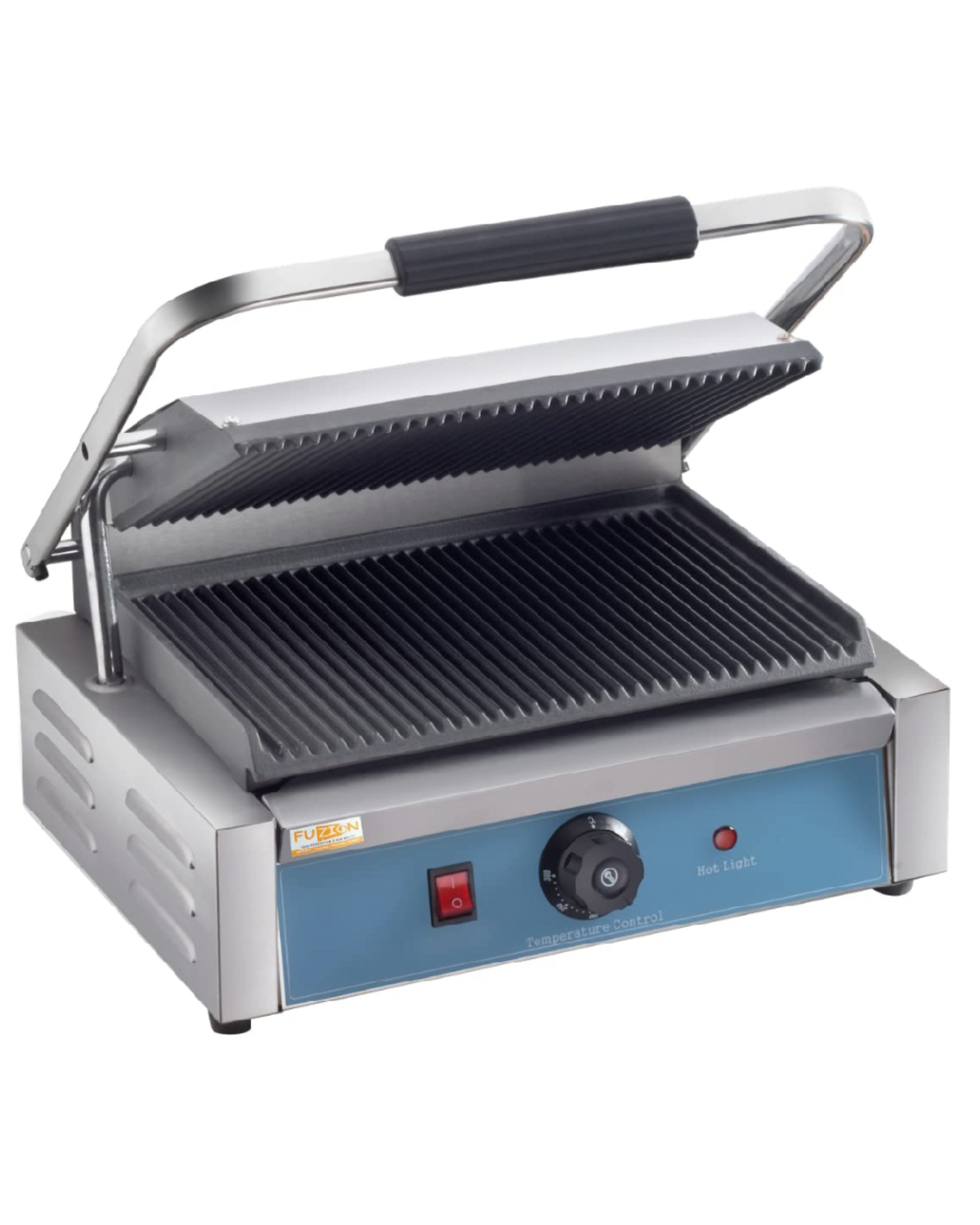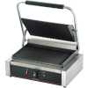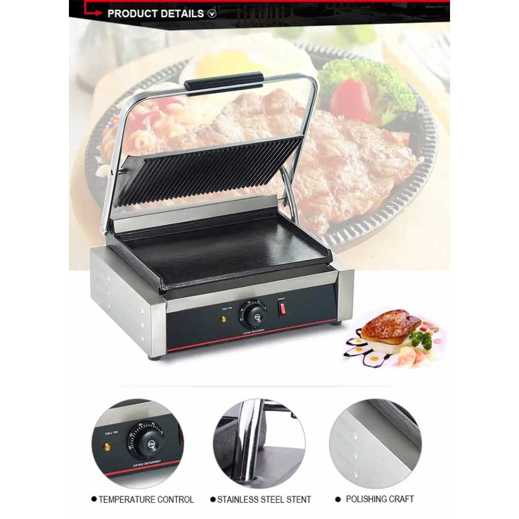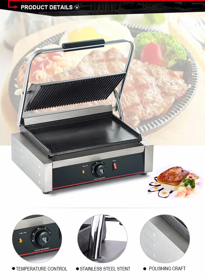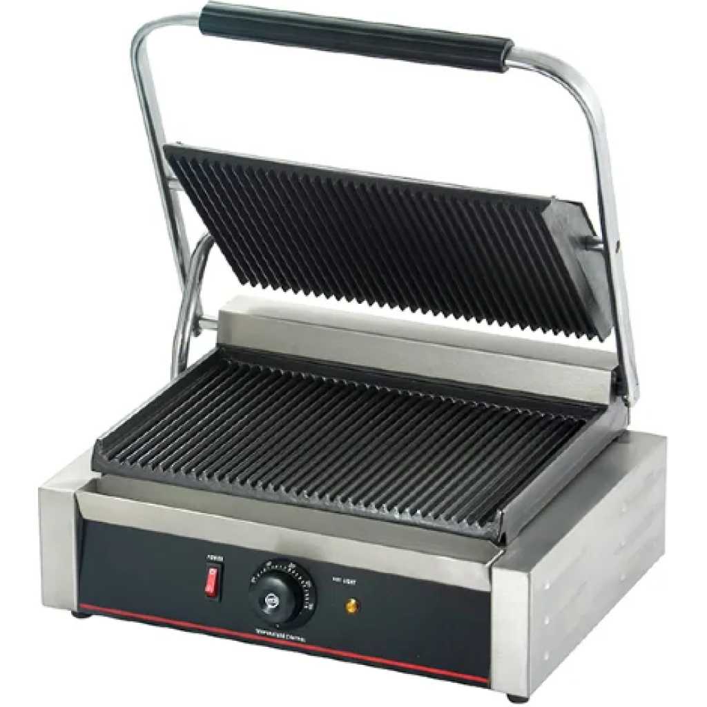 Commercial Single Panini Sandwich Grill with Grooved Plates Order This commercial electric Sandwich griller with copper wire brush & Crump collect tray. A perfect cafe equipment to prepare crispy grilled toasts. Grill sandwiches and other signature foods to perfection with this single panini sandwich grill with grooved plates. Boasting 230V of heating power, this single panini sandwich grill allows you to quickly and efficiently create your most popular sandwiches, quesadillas, and burgers. And, with a compact 12″ x 12″ footprint, you’ll have no trouble finding space for it in your sandwich shop, food truck, or concession stand. Grooved Grill Plates The grooved plates provide tantalizing grill marks for an excellent presentation, while also ensuring complete contact with your product for consistent, even heat supply. The cast iron plate construction provides long-lasting durability and strength. Specialized Hinge The specialized hinge allow the top plate to lay flat against the food rather than at an angle. This ensures complete contact and uniform cooking. Heavy-Duty Construction A heavy-duty, stainless steel construction ensures that the unit is built to withstand a rough and tough kitchen environment. Removable Grease Tray The edge of the grill plate is angled downward to collect grease and direct it into the removable grease tray. When it’s time to clean up, the tray can be removed and emptied quickly. Thermostatic Controls To ensure consistency, the thermostatic controls allow you to adjust the temperature of the grill to accommodate the appropriate cooking temperatures for different foods. With a 120-570 degree Fahrenheit range, you’ll have no trouble keeping up with high-demand. Product Overview Grooved plates provide tantalizing grill marks on paninis or sandwiches Specialized hinge allows top plate to lay flat for uniform cooking Temperature adjusts between 120 and 570 degrees to keep up with high-demand Stainless steel construction and cast iron plate provides durability Great for making paninis, sandwiches, quesadillas, and burger Key Features: Grooved Grill Plates Specialized Hinge Heavy-Duty Construction Thermostatic Controls Stainless Steel