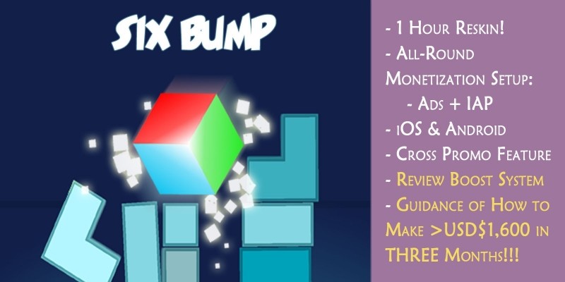 Six Bump - Complete Unity Project. Super addictive gameplay, built with features to work with my ASO strategy to help you earn $$$. Grab a copy and start earning!