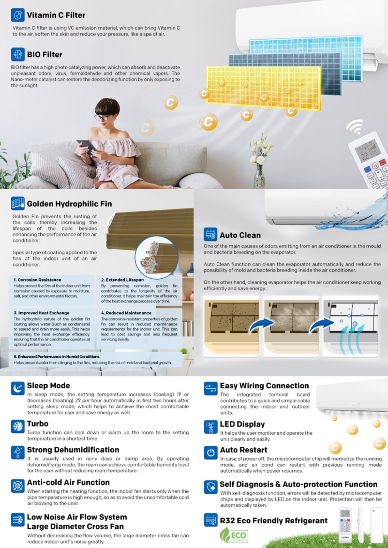 Key Features: Fast Cooling Energy Saving Low Noise Anti-Rust Coating Inner Thread Copper Tube 4D Air Flow High density anti-mildew filter GMCC Compressor