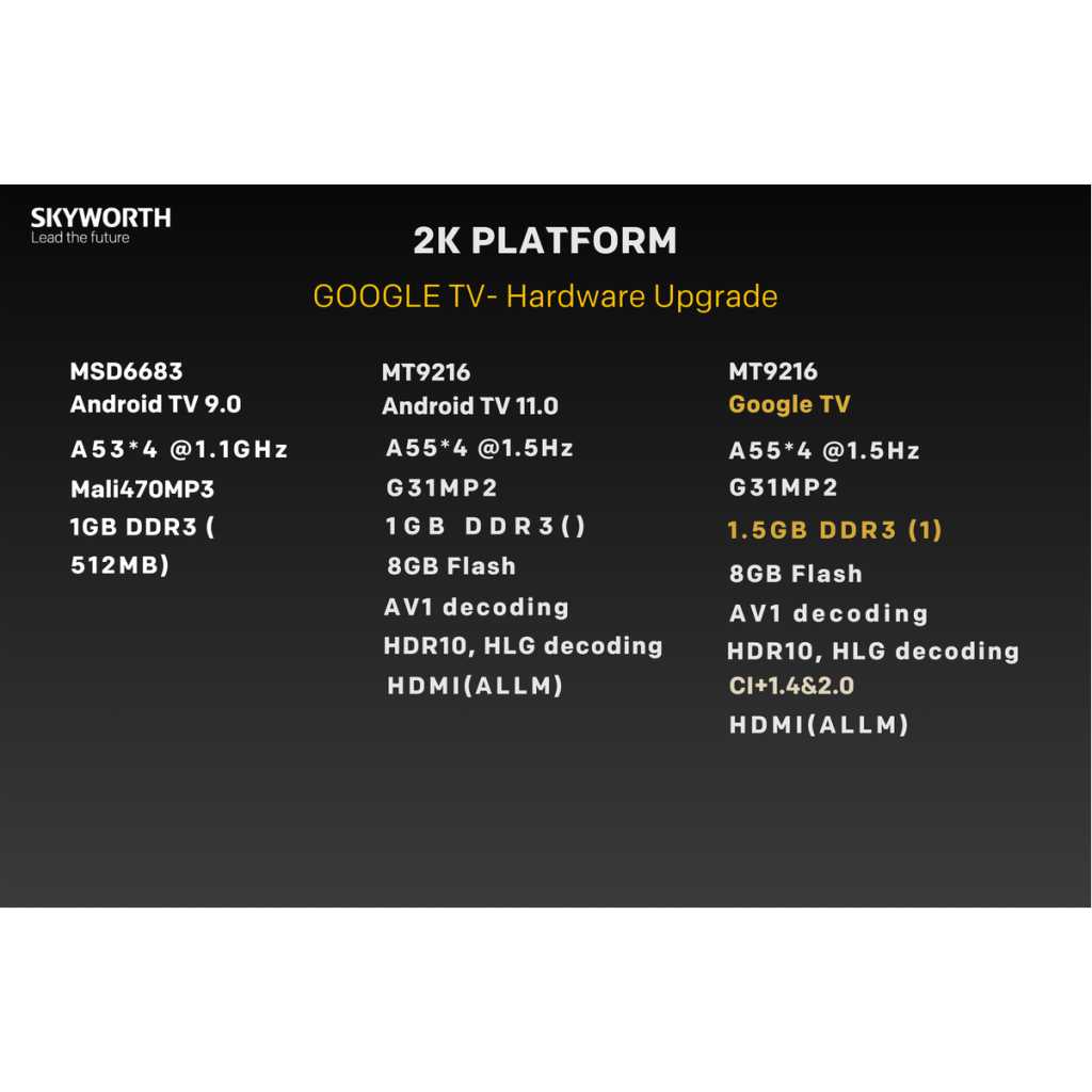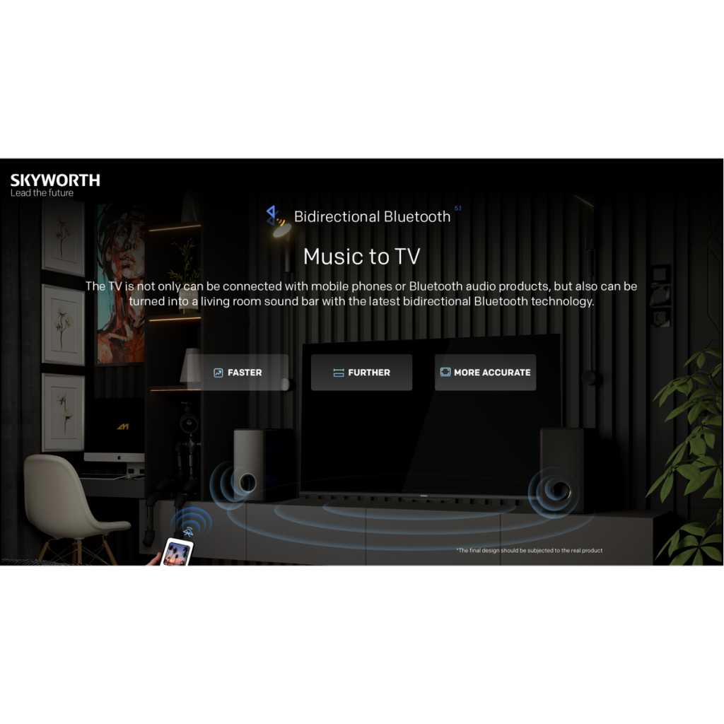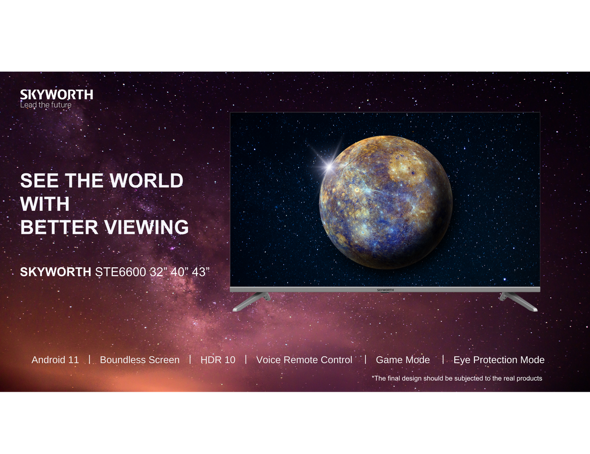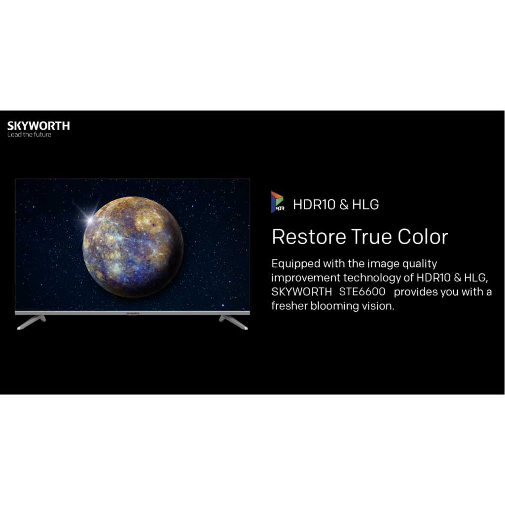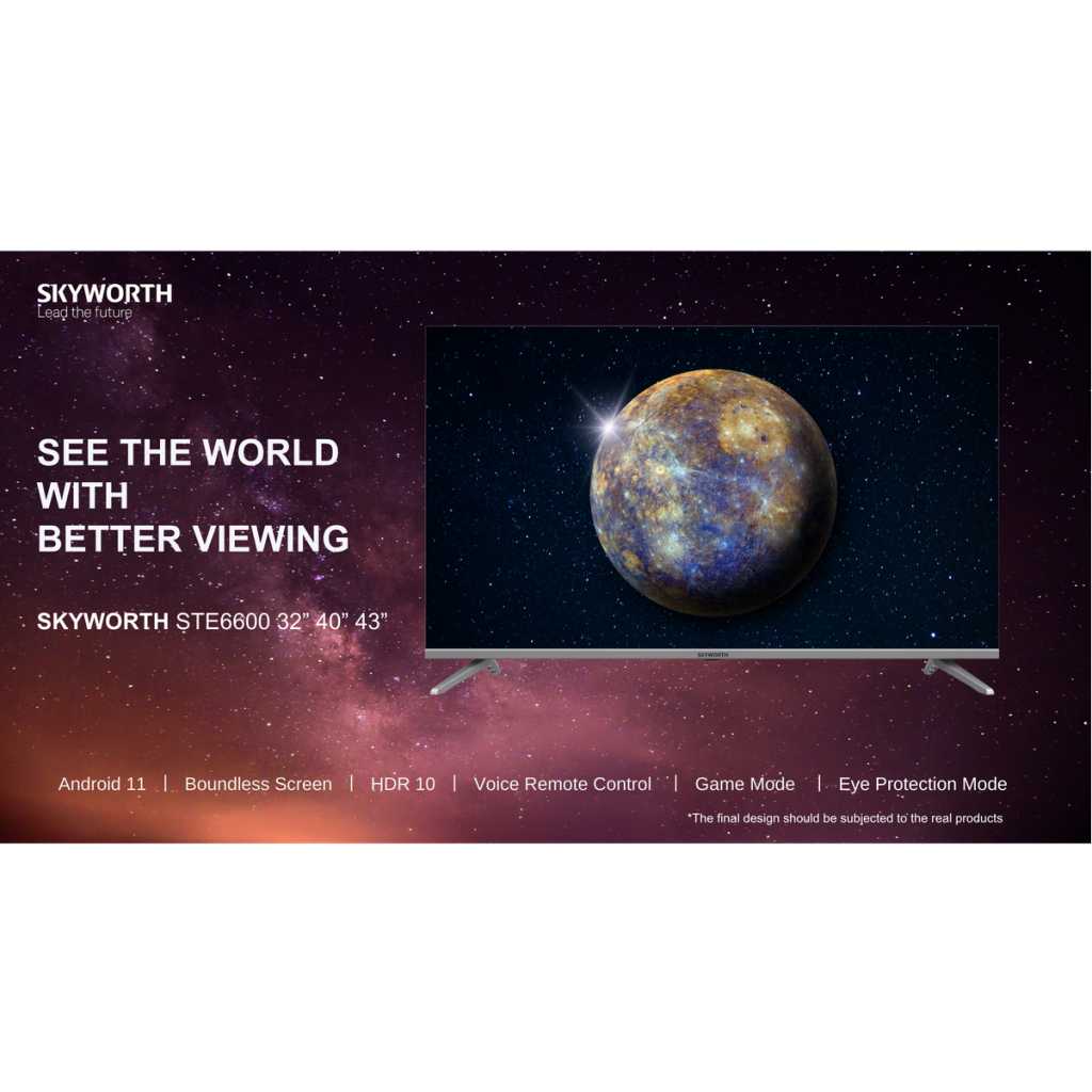 Skyworth 43″ STE6600 FHD Smart Google TV. – Google TV System with Google Play Store: Yes – DMR: 60Hz – Response Time: 8.5ms – DDR: 1.5GB – Flash: 8GB – Google Assistant: Yes – Netflix/Showmax/DSTV/Prime Video/Disney Plus: Yes (Subscription required) – YouTube/YouTube HDR: Yes – HDMI CEC & ARC: Yes – DTV Receiving System: DVB-T2/T/C – Brightness: 200nit – Colour Gamut:68% NTSC – Contrast Ratio: 3000:1 – Game Mode: Yes – Dolby Digital/Dolby Digital Plus: Yes Terminal Specifications – RF Input (3.5mm): 1 – Composite Input: 1 – AV Output (RCA) – HDMI Input: 2 (HDMI 1.4) – SPDIF Output: 1 (Optical) – LAN: 1 – USB (Multi -media): 2 (USB 2.0) – WIFI: 2.4G/5G; 2T2R – Bluetooth: Ver 5.1. Input & Output – Updating Interface: USB; Internet – EPG: Yes – Subtitle: Yes – Bluetooth: Yes Sound Specification – Maximum Output: 2 x 8W – Speaker Type: Non-detachable (down) – HDMI CEC & ARC Power Specifications – Power Supply: AC100-240V; 50/60HZ – Standby power: <0.5W – Power Consumption: 74W Dimensions & Weight – Dimension with stand (mm) 954.5 x 211.8 x 603 – Dimension w/o stand (mm) 954.5 x 86.9 x 558.5 – Box Dimension (mm): 1060 x 145 x 645 – Weight (Gross)(Kg): 8.4 – Weight (Net)(Kg): 6 What’s in the box – Stand: Yes – Remote Control: Yes Key Features: Skyworth 43″ STE6600 FHD Smart Google TV. – Google TV System with Google Play Store: Yes – DMR: 60Hz – Response Time: 8.5ms – DDR: 1.5GB – Flash: 8GB – Google Assistant: Yes – Netflix/Showmax/DSTV/Prime Video/Disney Plus: Yes (Subscription required) – YouTube/YouTube HDR: Yes – HDMI CEC & ARC: Yes – DTV Receiving System: DVB-T2/T/C – Brightness: 200nit – Colour Gamut:68% NTSC – Contrast Ratio: 3000:1 – Game Mode: Yes – Dolby Digital/Dolby Digital Plus: Yes