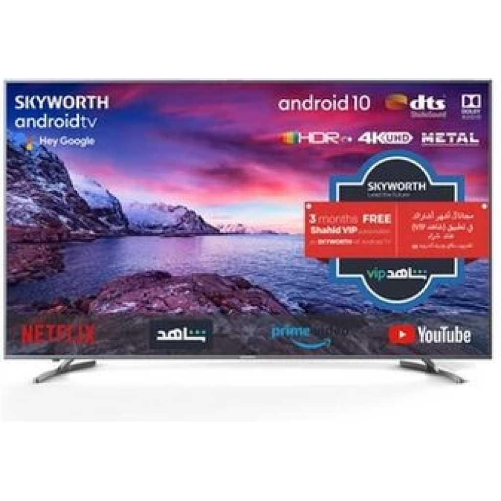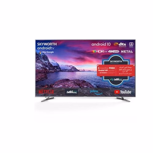Technical specifications and Features Dimensions Length: 12 cm Weight: 35 Kg Height: 102 cm Width: 168 cm Interface(s)/Port(s) Ethernet Port: Yes Speaker Type: Bottom Sound Throw Speaker Output: 12W x 2 Number of USB Inputs: 2 Number of HDMI Inputs: 3 Bluetooth: Yes Physical Characteristics Color: Silver Display Screen Size: 75″ Panel Type: LED Resolution (MP): 3840×2160 HD type: UHD 4K Memory Memory (internal): 16GB ROM RAM SIZE: 2.5GB Network & Communication Wireless LAN: Yes Others Depth: 12 cm Number of Digital Audio Optical Output: 1 Virtual Assistant Supported: Google Assistant Series Name: Middle-End 4K Series Refresh Rate: 60Hz Made in: China Response Time: 8ms Brand Name: Skyworth Smart Platform: ِAndroid Sound System: Dolby Audio Product Type: SMART LED TV ULTRA HD-4K Remote Control Type: Bluetooth Remote Voice Assistant Built-in: Yes oogle Android 10.0 UHD 4K Smart TV with Google Assistant, Voice Search, Google Play, Netflix, YouTube, Shahid, Chromecast built-in, 2GB RAM, 8GB ROM, DTS, Dolby Digital, HDR10+, Bluetooth, IPS, 3*HDMI, 2*USB Resolution 3840 x 2160 Brightness 300nit Dynamic Contrast 1200:1 DMR 60HZ Response Time 8 ms OSD English HDR 10 / HDR 10+ / HLG Yes Key Features: Resolution : 3840 x 2160 HDMI x 3 USB x 2 Youtube/Netflix/Prime Video UHD Digital DVB-T2 TV Google Assistant & Chromecast 3 Year warranty