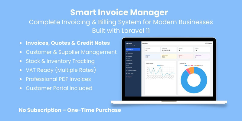 Smart Invoice Manager - Laravel Billing System. Modern Laravel invoicing system with quotes, credit notes, stock, VAT, PDF invoices and customer portal.