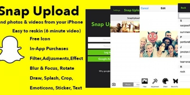 Snap Upload - iOS App Source Code. Upload your images or videos saved on your camera roll to Snapchat. Apply filters, write messages, enhance images, draw and much m