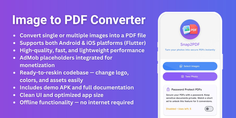 Snap2PDF – Photo to PDF Flutter App. Convert photos to PDF instantly! Fast, secure, and offline PDF creator with image merging and password protection.