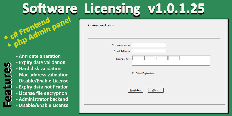 Software License Engine. c# class library that connects to a php backend hosted in a web server and checks if entered details match with the server side.