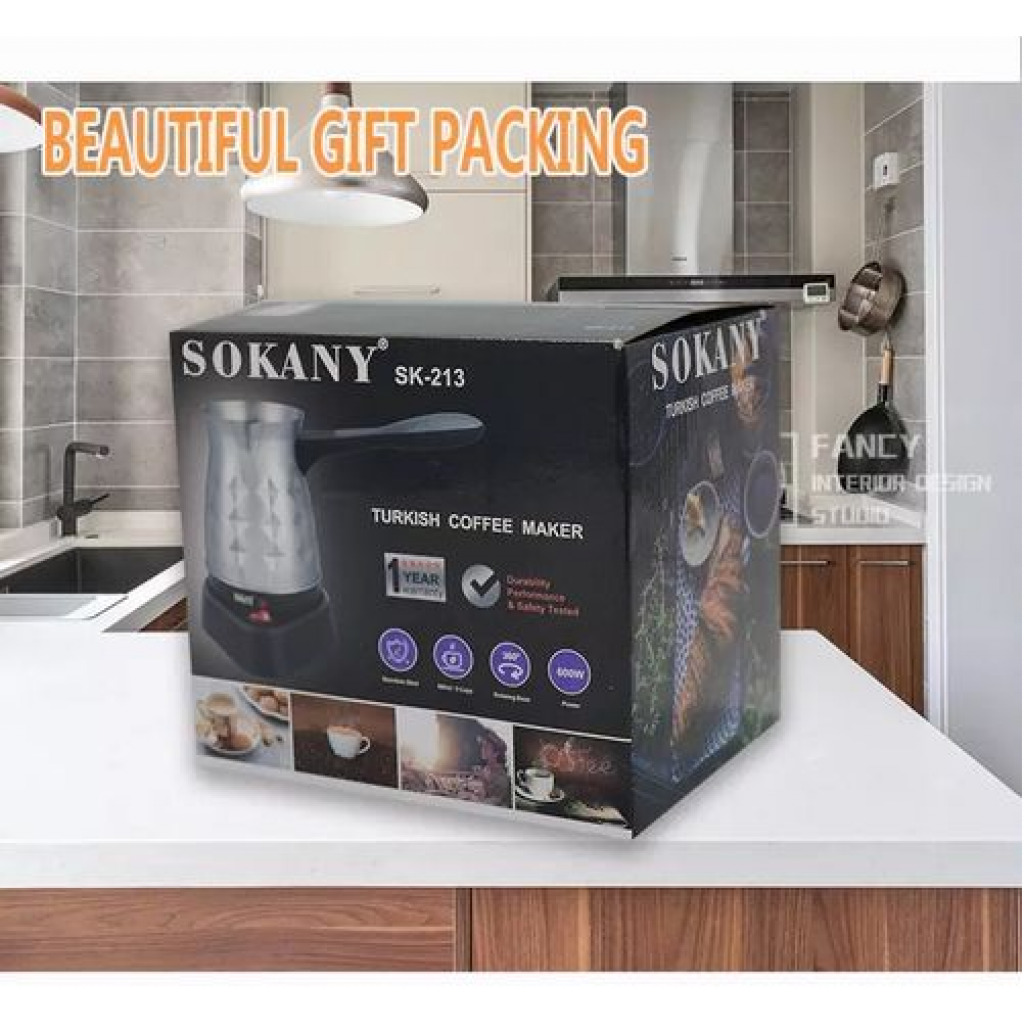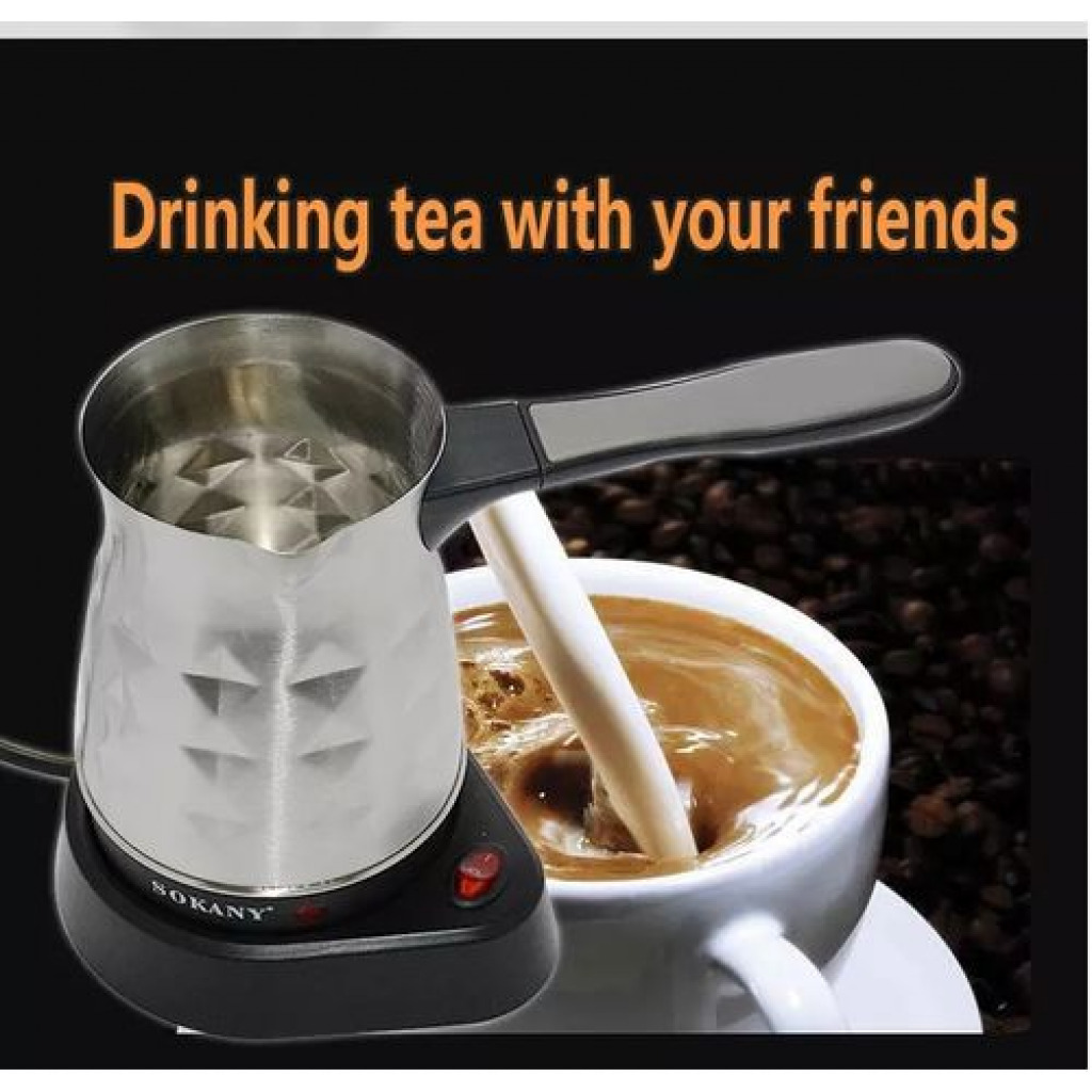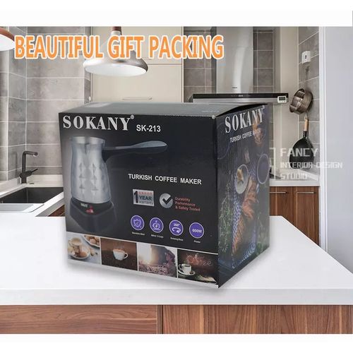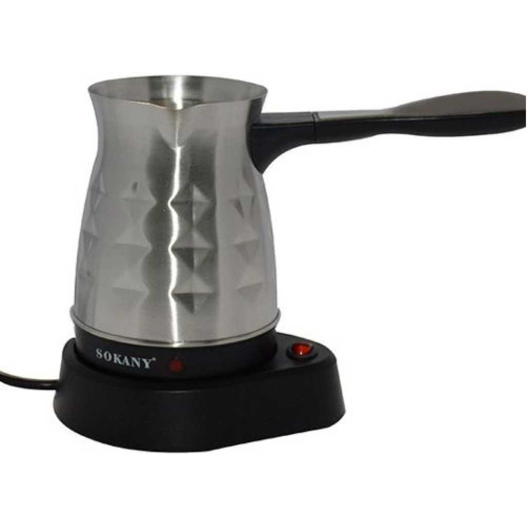 Key Features: Brand: Sokany Type: Coffee maker Material: Stainless Steel Wattage: 600 Watts It can prepare 5 cups of coffee Capacity: 500 milliliters Easy to clean Easy operation to prepare a cup of coffee