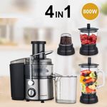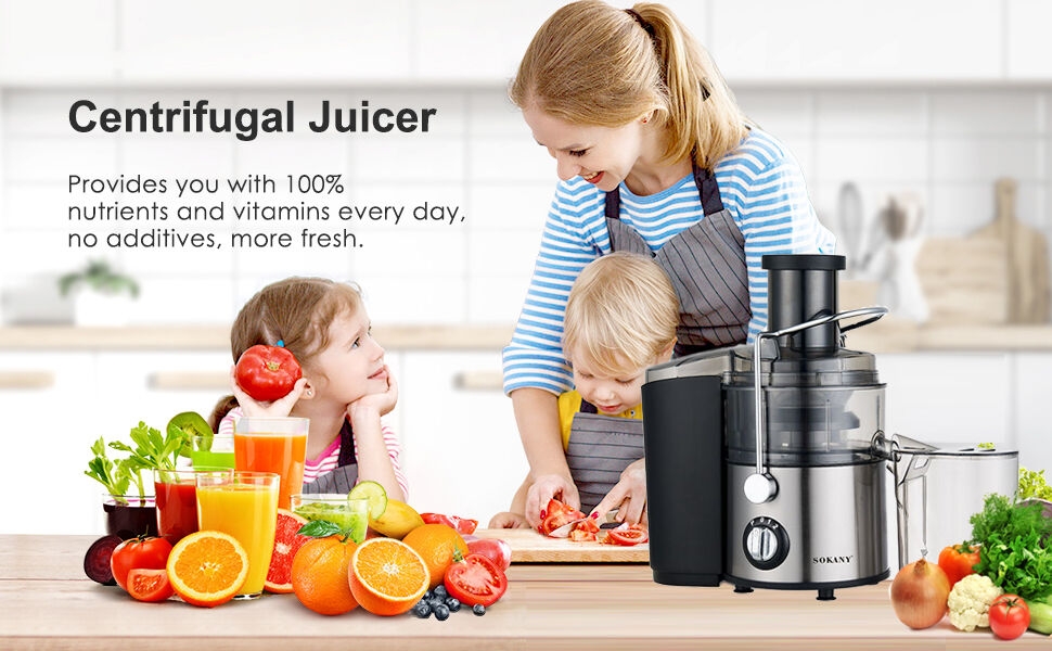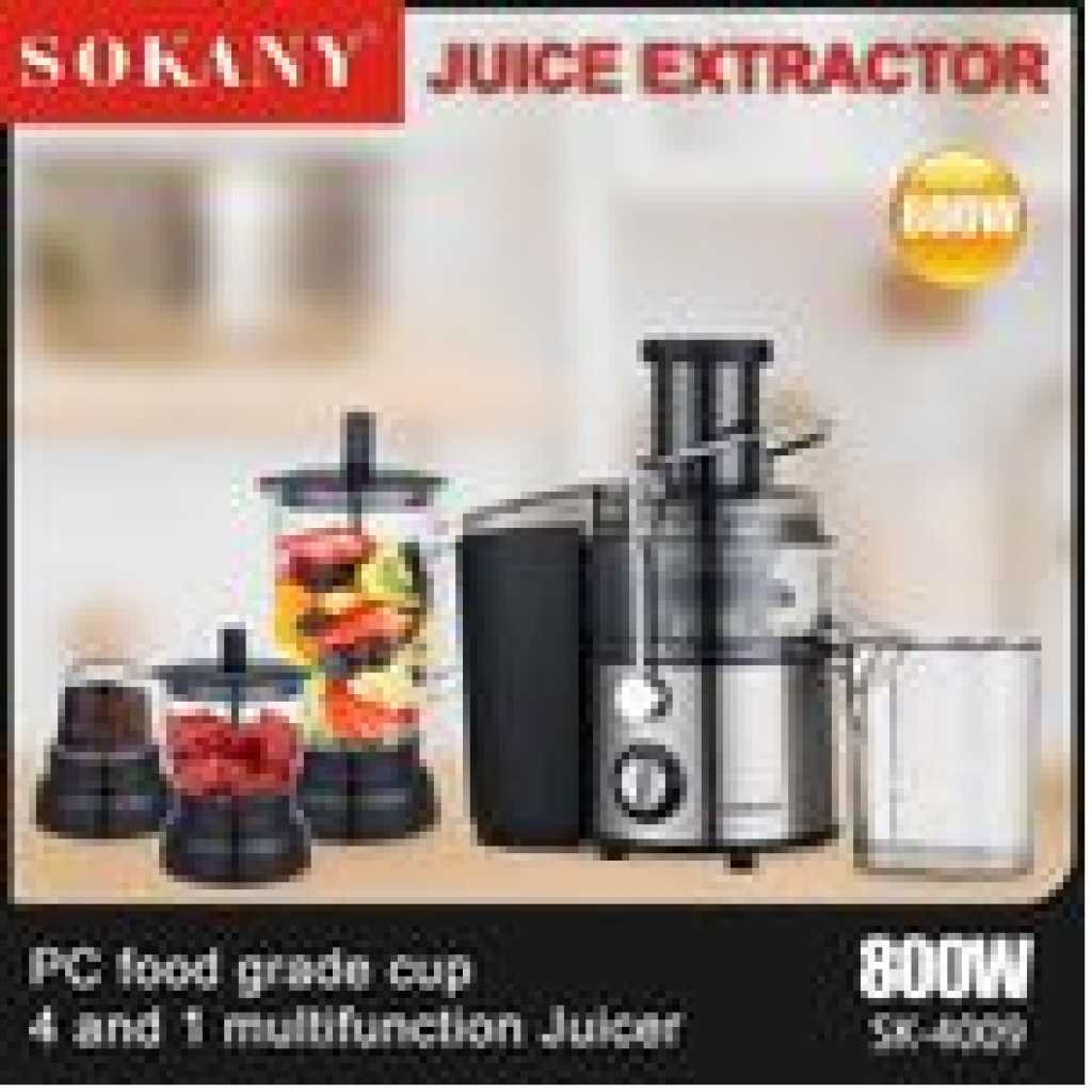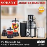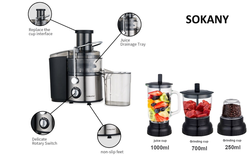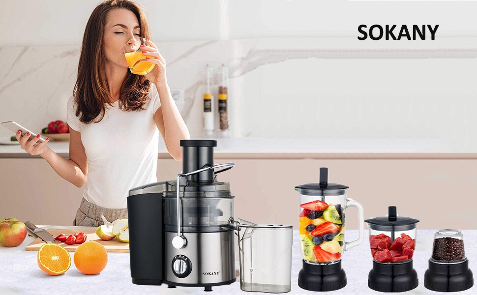 Key Features: Perfect 4 in 1 Juicer: SOKANY Juice extractor has four functions: juice extraction, blender, grinding and chopping, juice extractor and blender: Smoothie Blender is perfect for creating creamy frozen drinks and smoothies for the whole family, or entertaining guests. 0.7L Food Processor: you can easily chop onions, herbs, nuts, meat etc. 0.25L Jar For Grinding: For Fine and Grinding of Coffee Herbs and Spices. Save Prep Time: A wide chute to accommodate whole fruits and vegetables for minimal prep. The juicer is designed for efficiency and convenience, so you can enjoy fresh, homemade juice every day. 2 Speed + Pulse: Features 2 speeds to handle soft and hard vegetables and fruits in just seconds. “1” low speed for soft fruits and veggies, such as watermelon, orange, strawberry etc. “2” high speed for some hard fruits and veg, such as carrot, apple, pear etc. Let you customize your speed according to the ingredients. SOKANY juicer equips 800W motor: The juicer machine’s high-speed max power can reach 800Wmotor juices fruit and vegetable faster and with more vitamins and tastier results than a traditional one. a cup of homemade juice with less pulp and foam will be made only a few seconds. Easy to Clean: Simple to use and all removable parts are dishwasher safe, cleanup will never feel like a chore. Safety Design: Juicer Extractor with locking system arm, Secure the locking system arm in place before using the juicer Overload protection system will switch off machine once overheating occurs, ensure safety and extend service life.