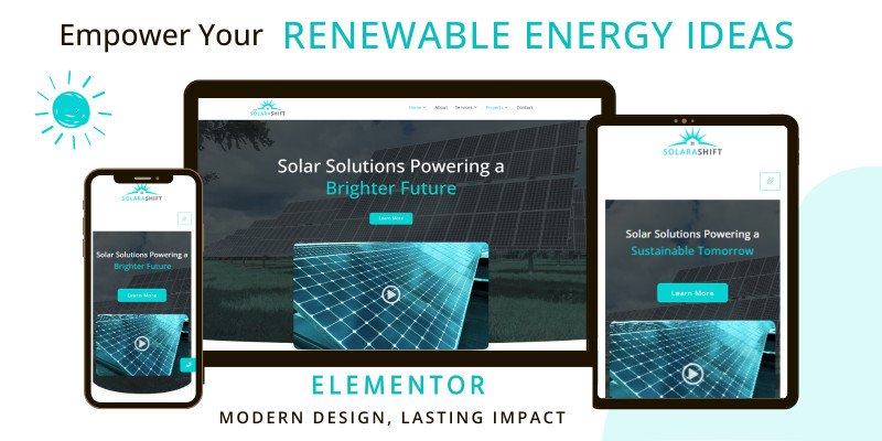 SolaraShift - Elementor Template. SolaraShift is a modern Wordpress Elementor template for solar energy companies, with a responsive layout and easy customization.