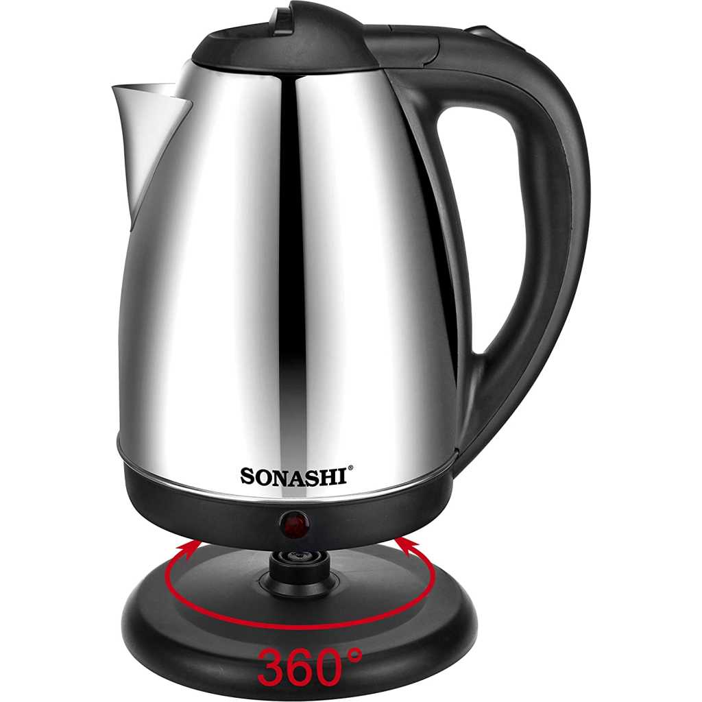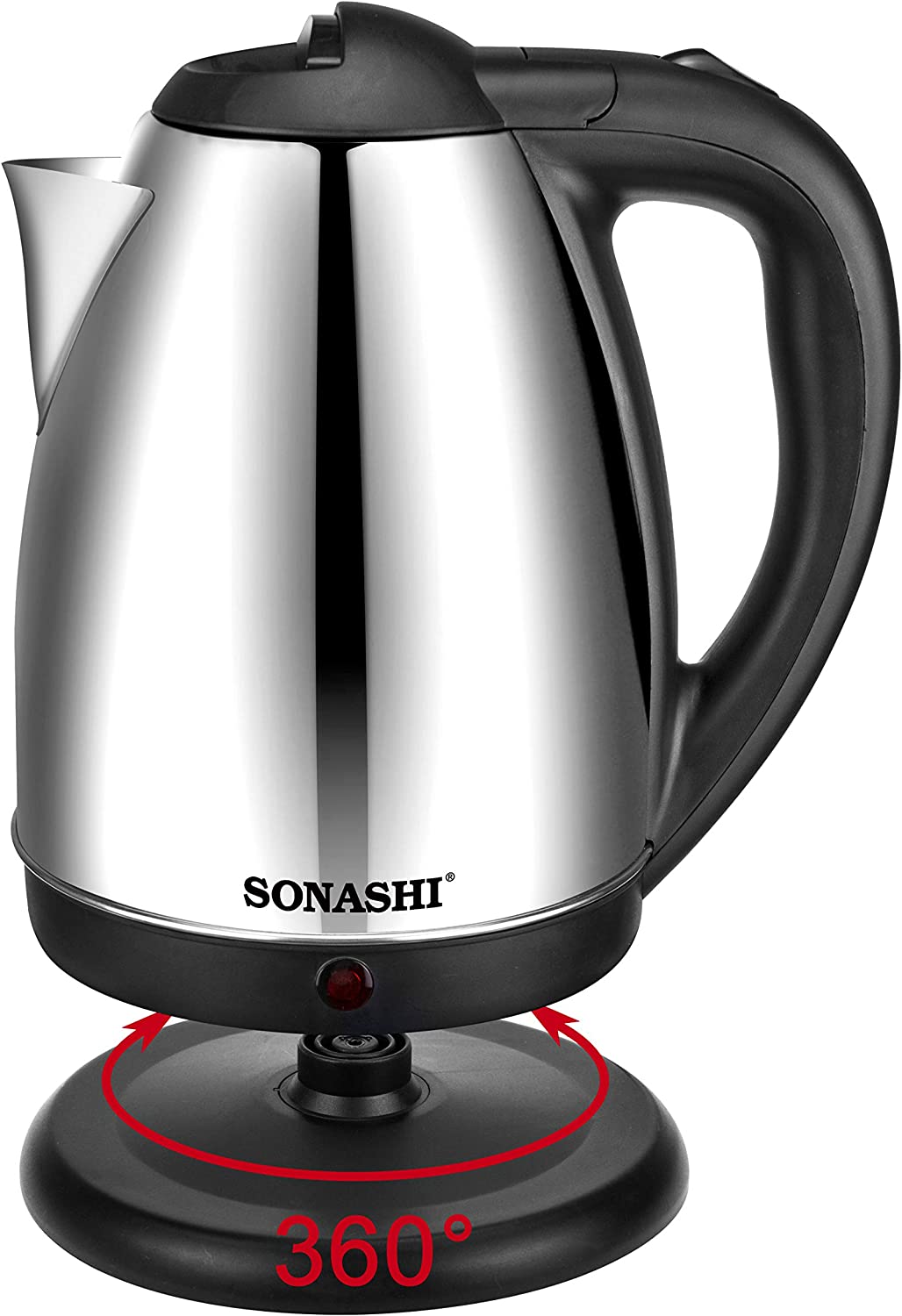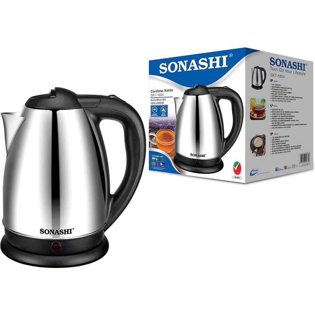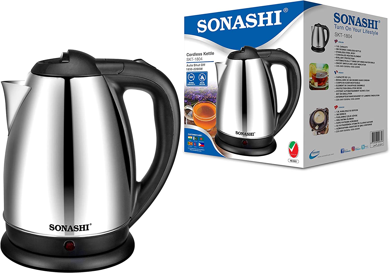 Sonashi 1.8 L Cordless Kettle SKT-1804 – Stainless Steel Kettle w/ Spray Coating, 360-degree Swivel Base, Auto Shutdown, Power On/Off Indicator Light | Home Appliances. Key Features: Sonashi 1.8 L Cordless Kettle SKT-1804. Kitchen Essentials: Sonashi kettle is an essential kitchen item with concealed heating element for fast boiling of water and cooking soups, instant noodles, tea, and coffee. Powered by a 2200W motor it boils 1.8l of water within a few minutes. Cordless Kettle: Sonashi 1.6l kettle is an advanced kitchen appliance with a cordless design. It sits on a 360-degree swivel base attached to a standard power source for heating, after which it can be detached and taken anywhere. It is compact and perfect for traveling. Safety Features: This electric kettle is fitted with advanced safety features like power on/off indicator light, boil-dry protection that automatically shuts down the kettle if there is no water inside the tank or water got used up while heating. It is safe and easy to use by people of all ages. Construction & Design: This kitchen tool is manufactured from premium quality 304 stainless steel with spray coating for superior finish and longevity. It features a wide-mouth opening for easy filling and cleaning. The cool-touch handle makes it convenient to hold and pour. Product Specification: Sonashi 1.8L Stainless Steel Cordless Electric Kettle requires minimal power supply input of 220-240V and 50/60Hz. It is powered by a strong 1850-2200W motor for quick and efficient boiling performance.