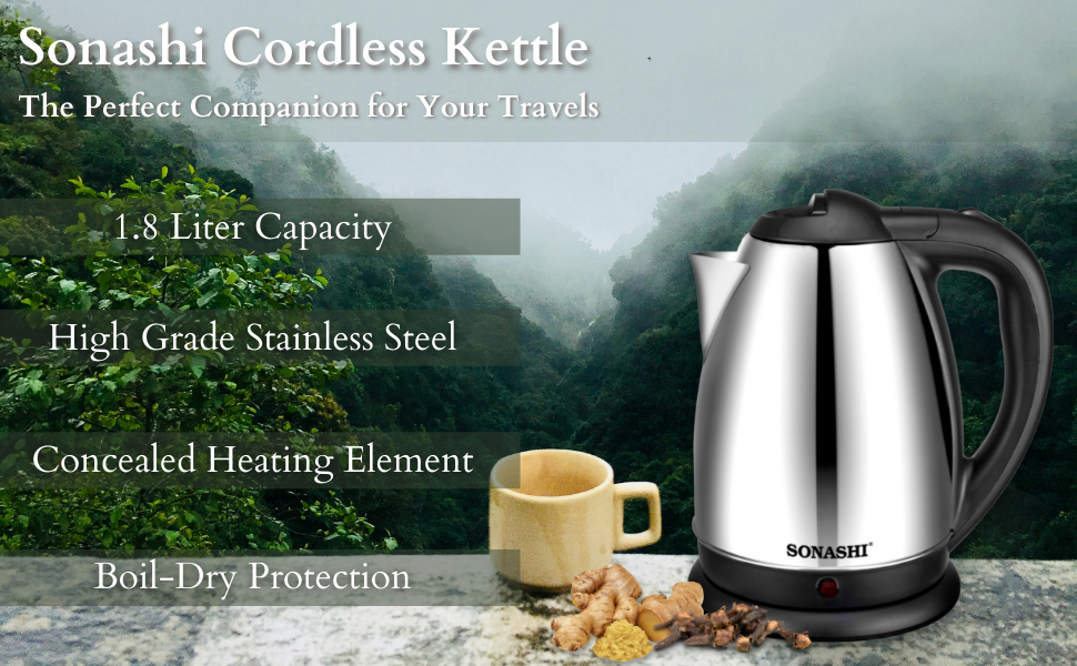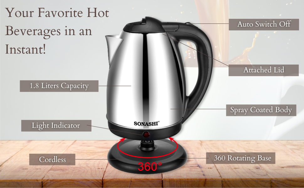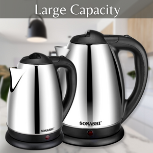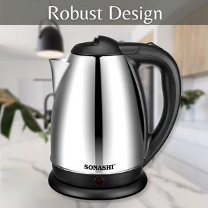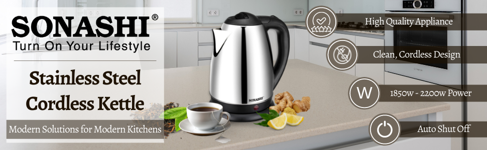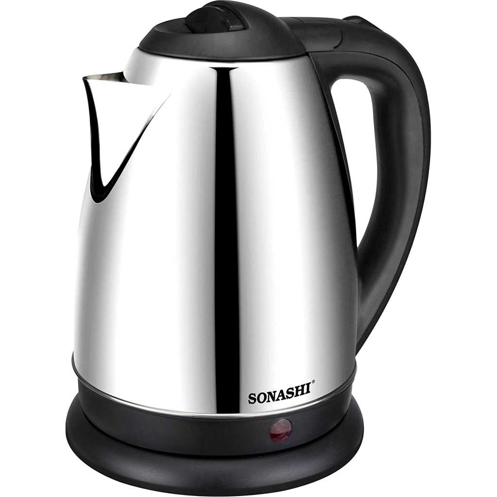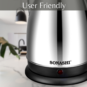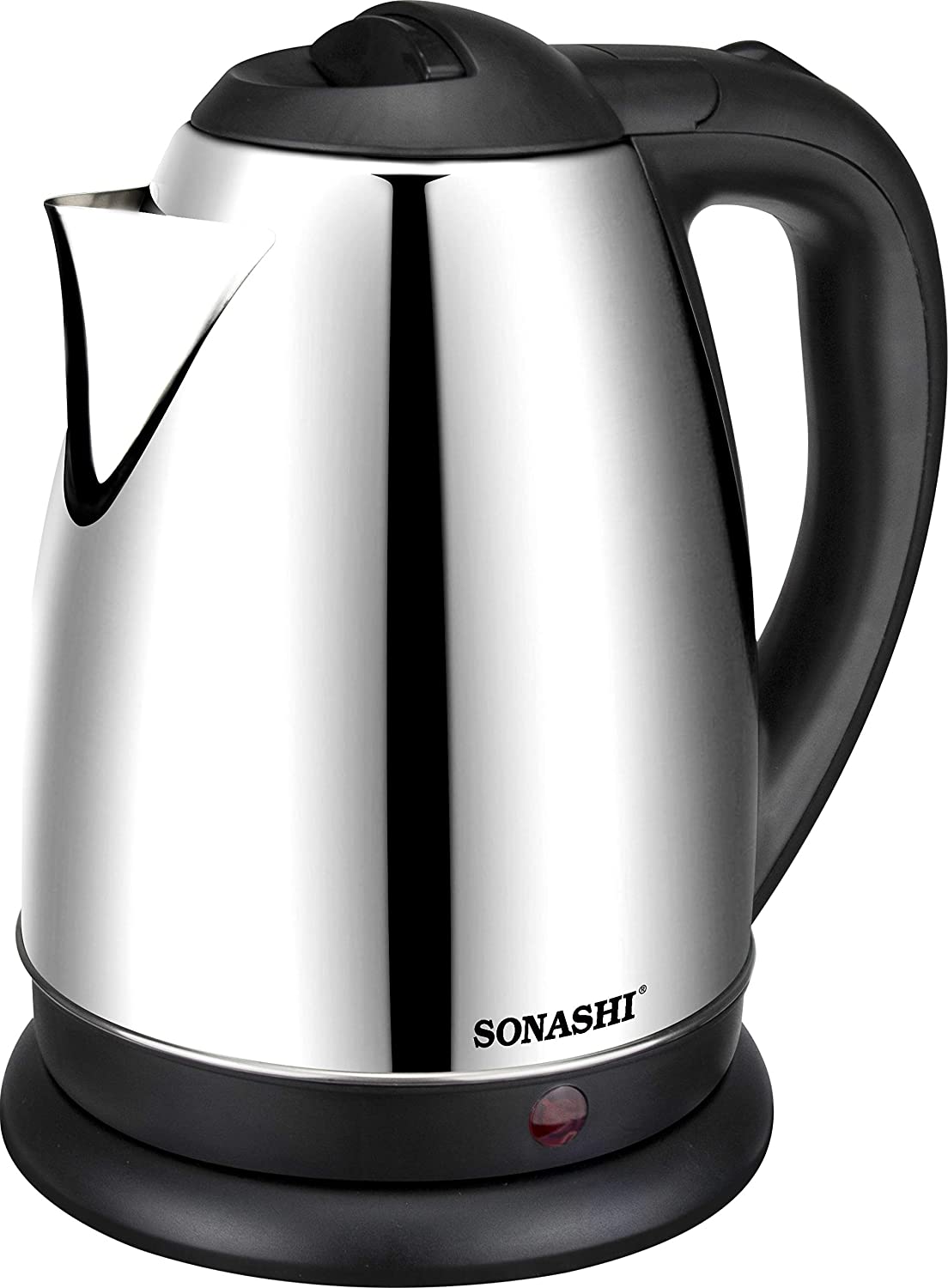 Sonashi 1.8 L Cordless Kettle SKT-1804 – Stainless Steel Kettle w/ Spray Coating, 360-degree Swivel Base, Auto Shutdown, Power On/Off Indicator Light | Home Appliances. Key Features: Sonashi 1.8 L Cordless Kettle SKT-1804. Kitchen Essentials: Sonashi kettle is an essential kitchen item with concealed heating element for fast boiling of water and cooking soups, instant noodles, tea, and coffee. Powered by a 2200W motor it boils 1.8l of water within a few minutes. Cordless Kettle: Sonashi 1.6l kettle is an advanced kitchen appliance with a cordless design. It sits on a 360-degree swivel base attached to a standard power source for heating, after which it can be detached and taken anywhere. It is compact and perfect for traveling. Safety Features: This electric kettle is fitted with advanced safety features like power on/off indicator light, boil-dry protection that automatically shuts down the kettle if there is no water inside the tank or water got used up while heating. It is safe and easy to use by people of all ages. Construction & Design: This kitchen tool is manufactured from premium quality 304 stainless steel with spray coating for superior finish and longevity. It features a wide-mouth opening for easy filling and cleaning. The cool-touch handle makes it convenient to hold and pour. Product Specification: Sonashi 1.8L Stainless Steel Cordless Electric Kettle requires minimal power supply input of 220-240V and 50/60Hz. It is powered by a strong 1850-2200W motor for quick and efficient boiling performance.