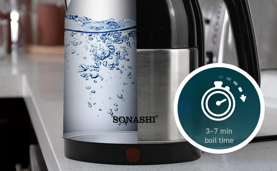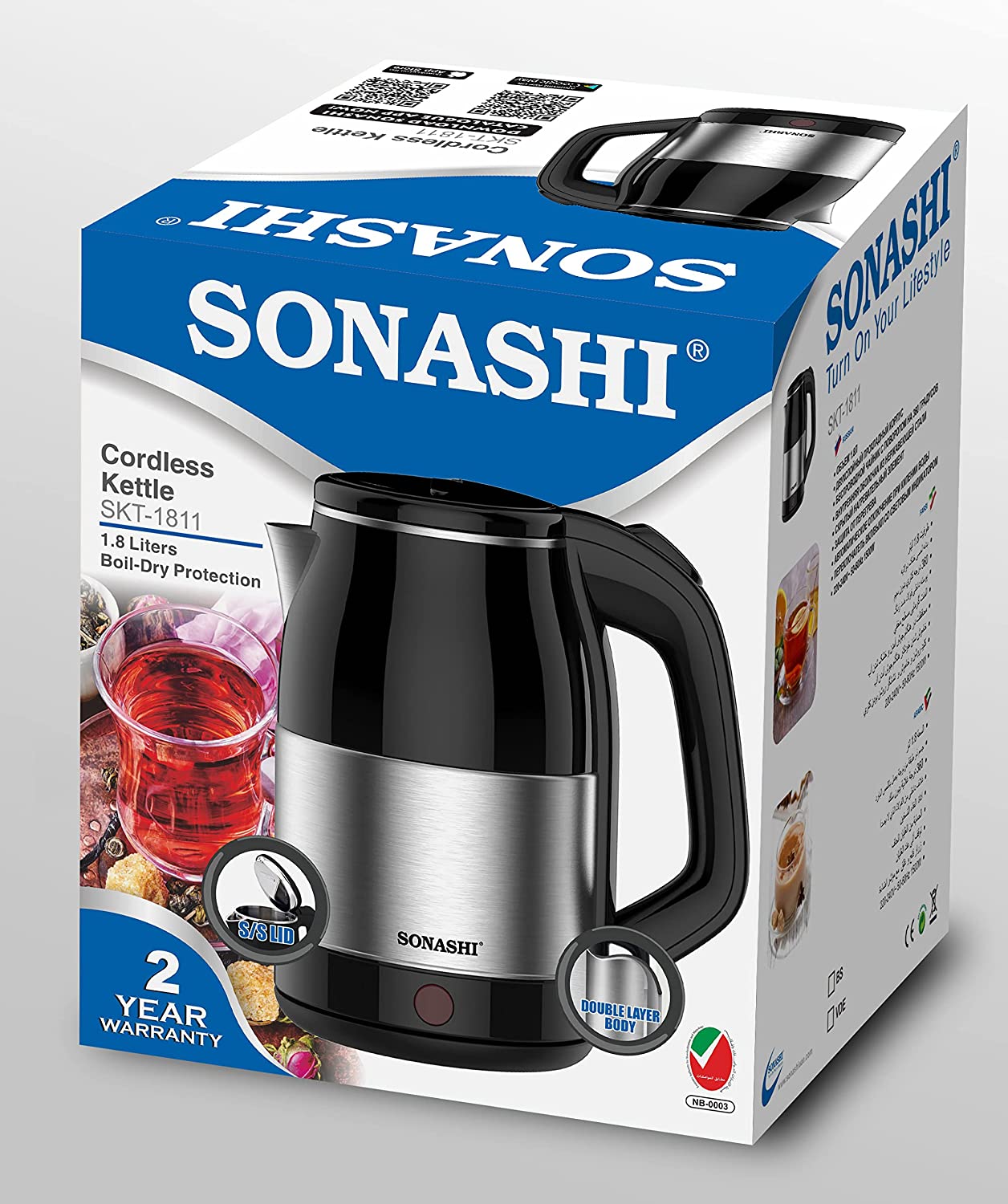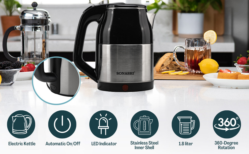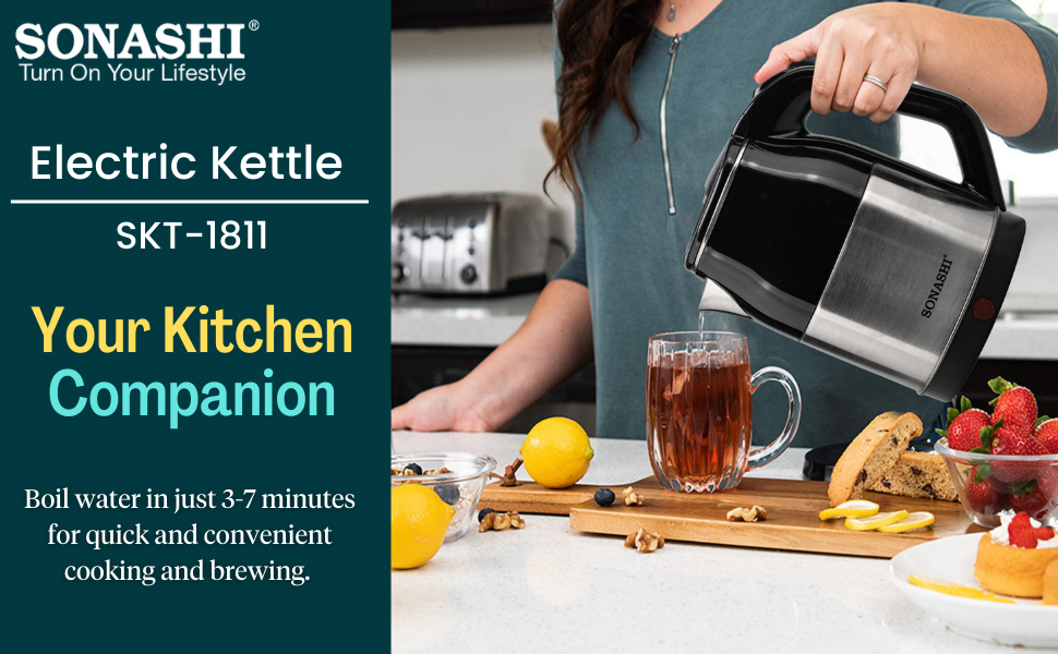 Sonashi 1.8 Litres Stainless Steel Cordless Kettle SKT-1811. Key Features: Sonashi 1.8 Litres Stainless Steel Cordless Kettle SKT-1811. 1.8 L Capacity / 360 Degree Cordless Kettle Double Layer Cool Touch Body / Stainless Steel Inner Shell Concealed Heating Element / Boil Dry Protection Automatically Turns Off When Water Boils / On/Off Switch and Light Indicator 220-240V – 50/60Hz 1500W