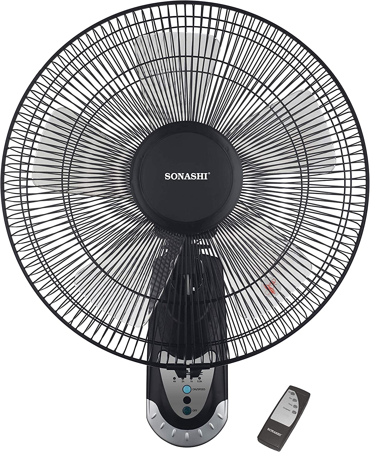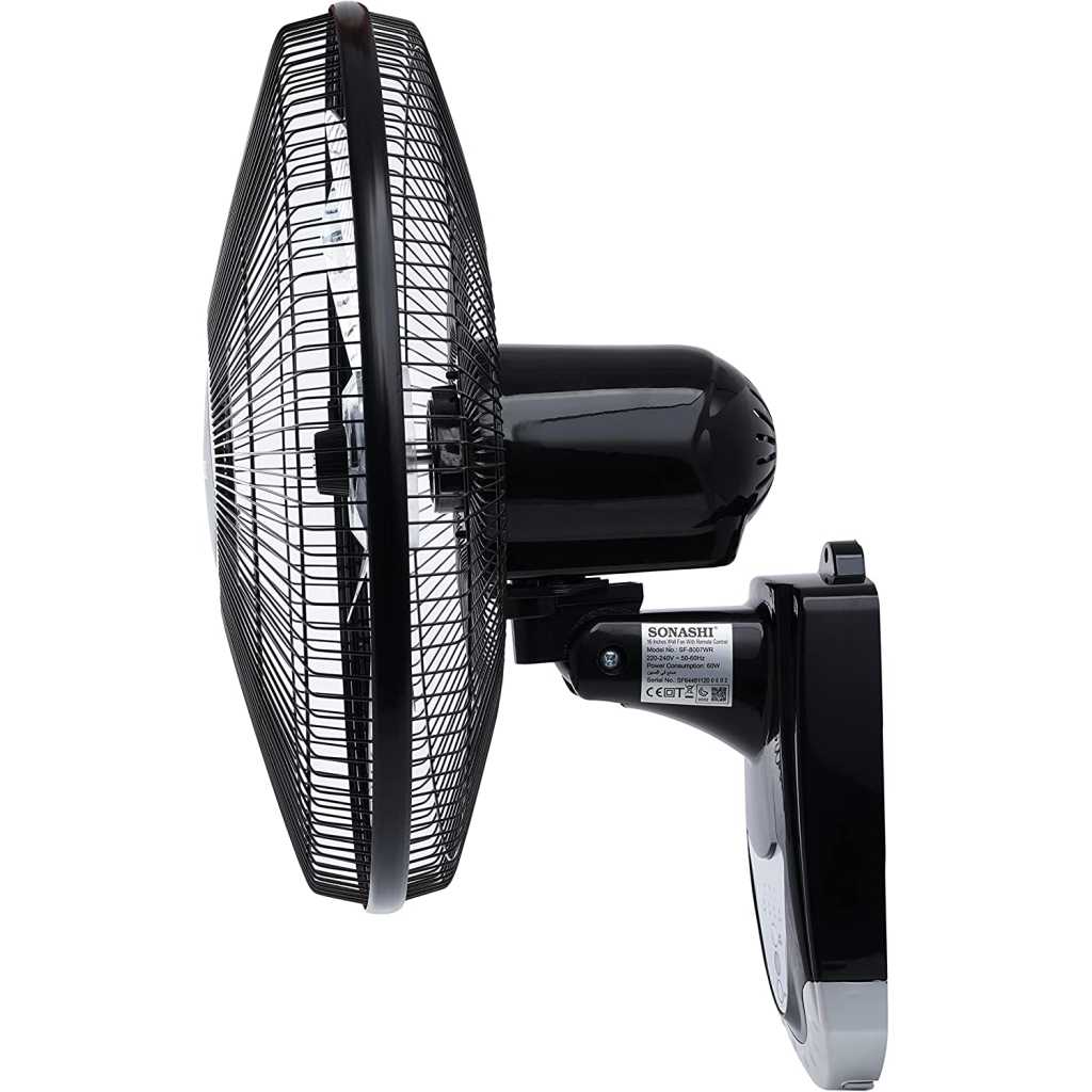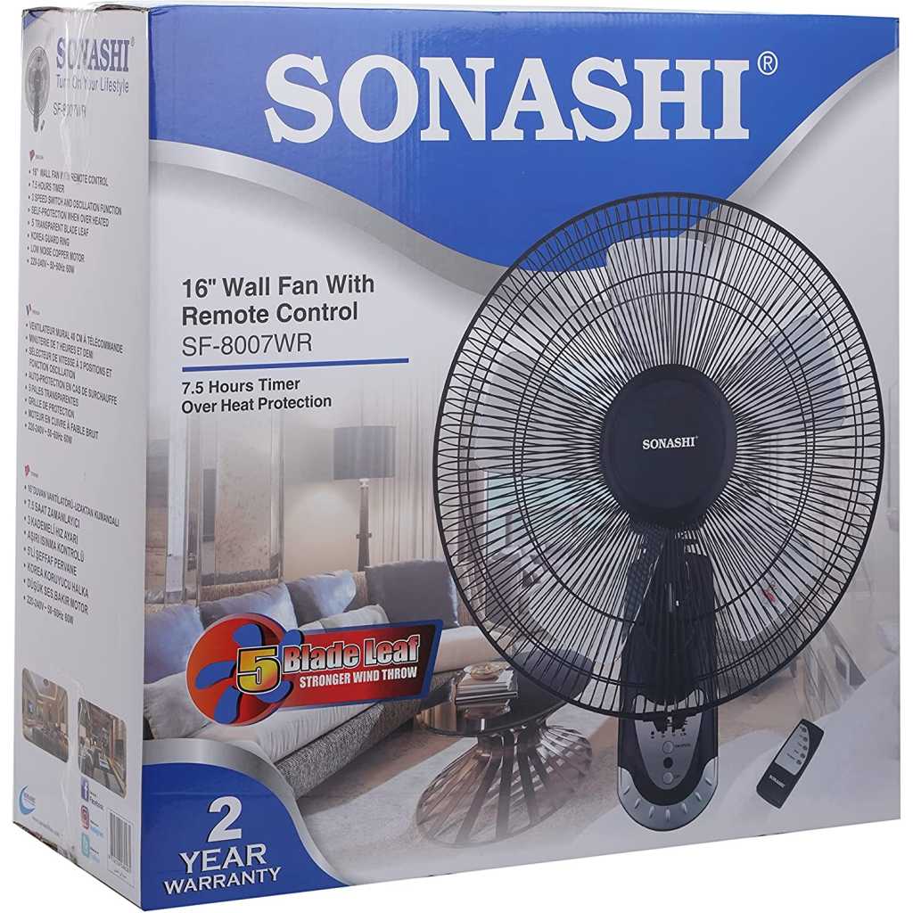 Sonashi 16 Inch Wall Fan With Remote Control Black SF-8007WR. Key Features: Sonashi 16 Inch Wall Fan With Remote Control Black SF-8007WR. Sleek Wall Fan: Sonashi Wall Mount Fan features a black and silver finish with a sleek design. One can easily install it on the wall for an ultimate cooling experience. Unparalleled Durability: This wall fan is made of heavy-duty high-quality material that ensures a stable, consistent, and lasting performance. its 5 PP transparent blades offer consistent cooling. The Korea Guard Ring aids air circulation. Versatile Wall Fan: This black wall fan offers three modes for appropriate cooling. It comes with a remote control so one can make settings from a distance without physically touching the fan. Minimizes Noise: Equipped with transparent blades and a copper motor, the Sonashi Wall Fan produces minimal noise and avoids disturbing your power naps. It features an auto-protection function that automatically prevents over-heating. Product Specifications: This black wall mount fan uses up to 240V of power to operate. It features 5 PP transparent blades, Korea Guard Ring, three Mode choices, and an auto-protection function for optimal performance. Use the remote control for convenience.