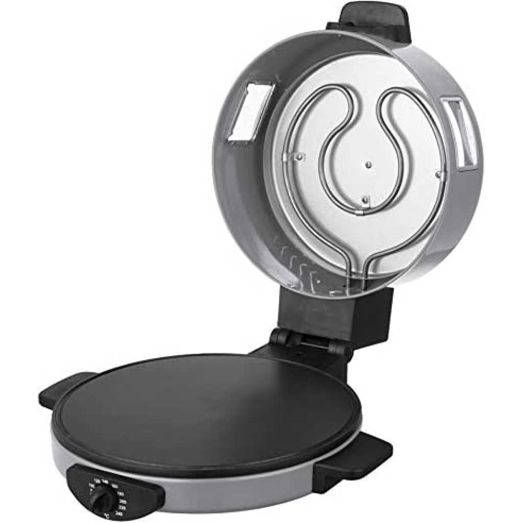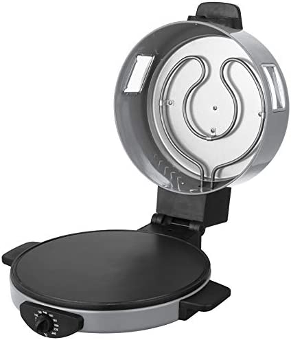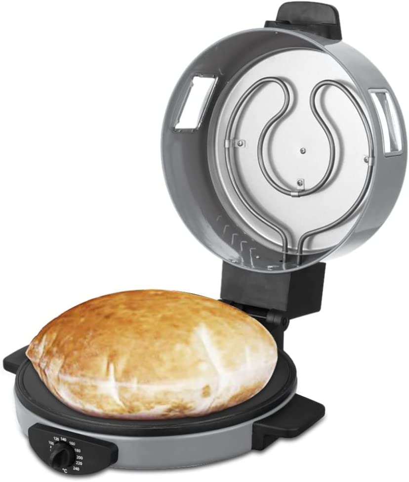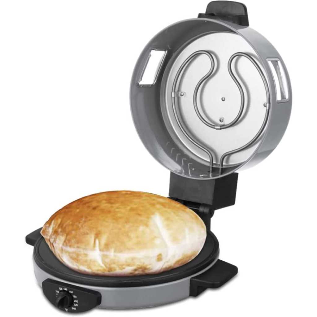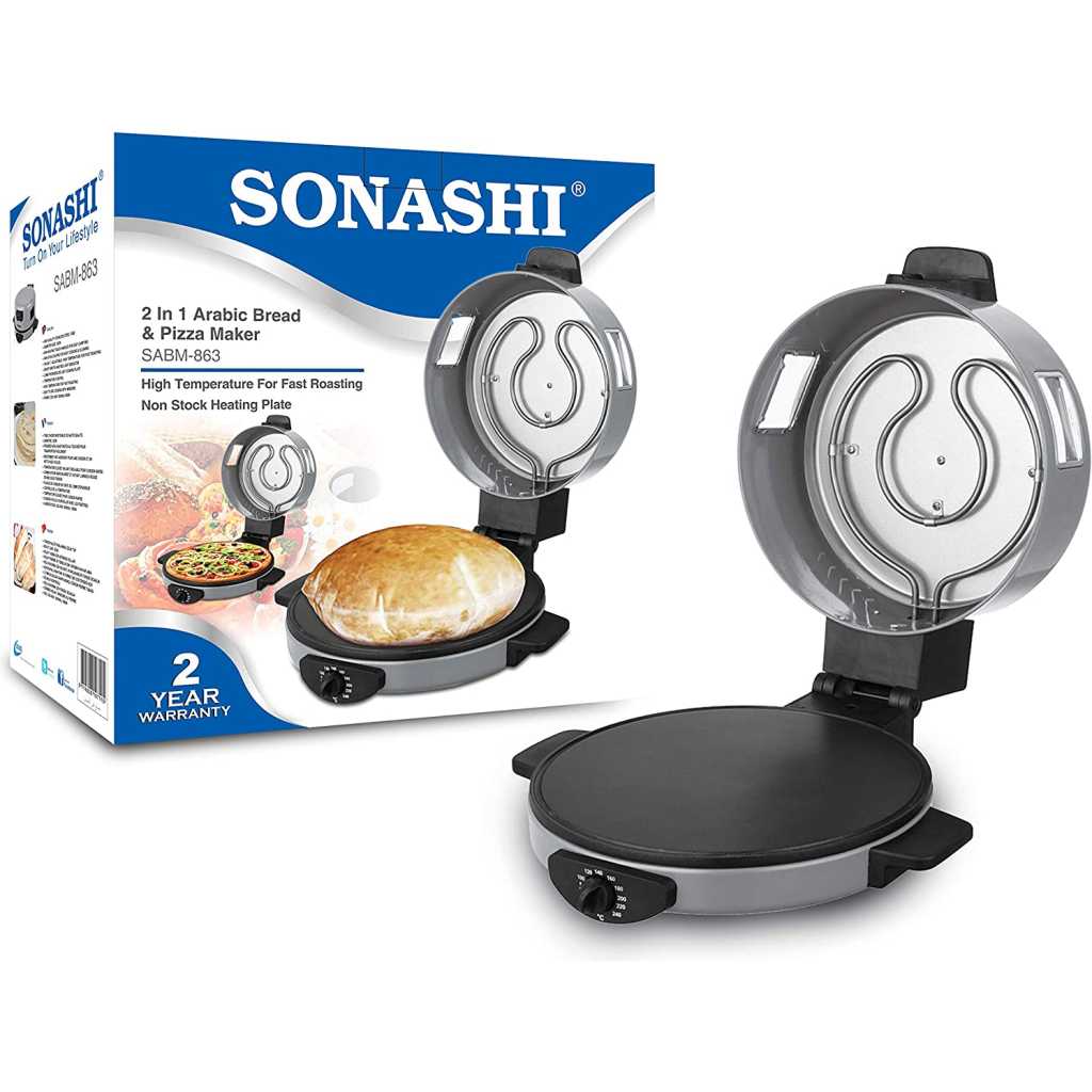 SONASHI 2-in-1 Arabic Bread & Pizza Maker SABM-863 – Stainless Steel Tube, On/Off Switch, Non-Stick Coating, Thermostat Control | 220-240 V ~ 50/60 Hz, 1800 W | Specialty Kitchen Appliances. Sonashi SABM-863 2 In 1 Arabic Bread and Pizza Maker is the tortilla maker is bolstered with a stainless-steel tube for uninterrupted usage along with non-stick coating for hassle-free cleaning. The Arabic pizza maker has cool-touch handles to prevent scalding. Make a variety of flatbreads such as Arabic bread, rotis, tortillas, pizzas, manakish, etc. without breaking a sweat. The quality pizza-bread maker by Sonashi ensures you treat guests with exotic breads, cooked to perfection. The 2-in-1 roti maker machine boasts an adjustable temperature between 180-240 degree celcius and has a switch for optimal control during cooking. This allows for fast roasting of bread so that you get just the type of crust you desire. Key Features: SONASHI 2-in-1 Arabic Bread & Pizza Maker SABM-863 – Stainless Steel Tube, On/Off Switch, Non-Stick Coating, Thermostat Control | 220-240 V ~ 50/60 Hz, 1800 W | Specialty Kitchen Appliances. 2-IN-1 ARABIC BREAD MAKER: Make a variety of flatbreads such as Arabic bread, rotis, tortillas, pizzas, manakish, etc. without breaking a sweat! The quality pizza-bread maker by SONASHI ensures you treat guests with exotic breads, cooked to perfection. HIGH QUALITY CONSTRUCTION: The tortilla maker is bolstered with a stainless-steel tube for uninterrupted usage along with non-stick coating for hassle-free cleaning. The Arabic pizza maker has cool-touch handles to prevent scalding. ADJUSTABLE TEMPERATURE: The 2-in-1 roti maker machine boasts an adjustable temperature between 180-240 ℃ and has a switch for optimal control during cooking. This allows for fast roasting of bread so that you get just the type of crust you desire. SMART DESIGN: The thoughtfully constructed pizza maker is topped with several useful features such as a viewing window to see if the cooking is progressing correctly, and a vented dome lid to get a crispy exterior every time. The red-light indicator signifies that the bread is ready! PRODUCT SPECIFICATIONS: The 2-in-1 electric bread maker runs on a voltage of 220- 240 V and has a power of 1800 W. It features a 30 cm diameter, a 2.55 mm thick die-cast cooking plate.