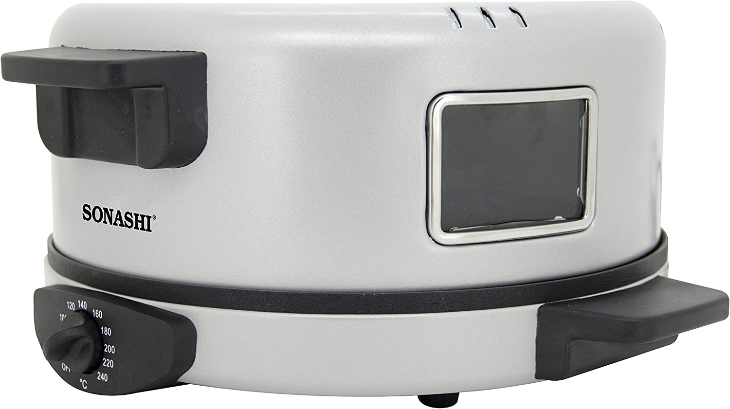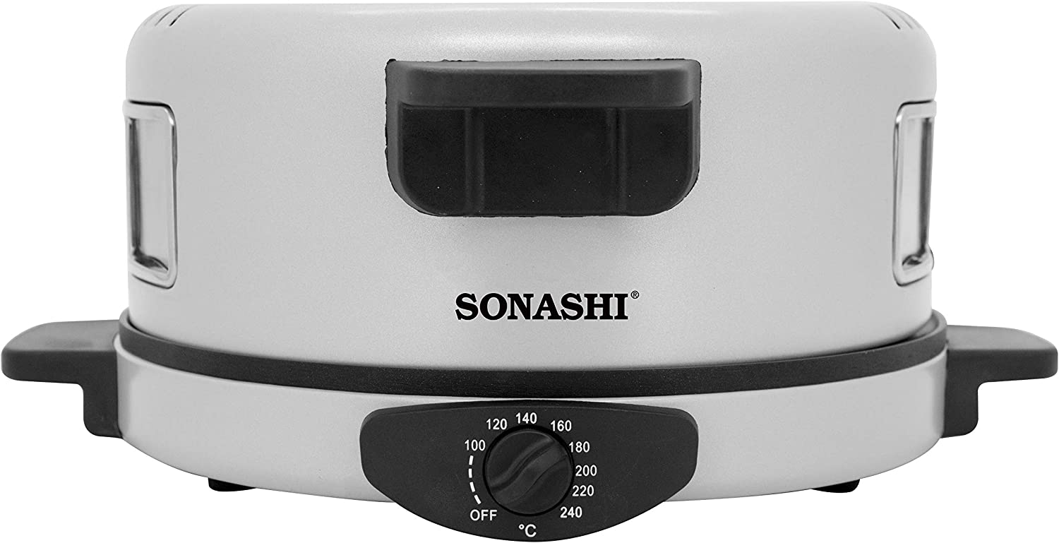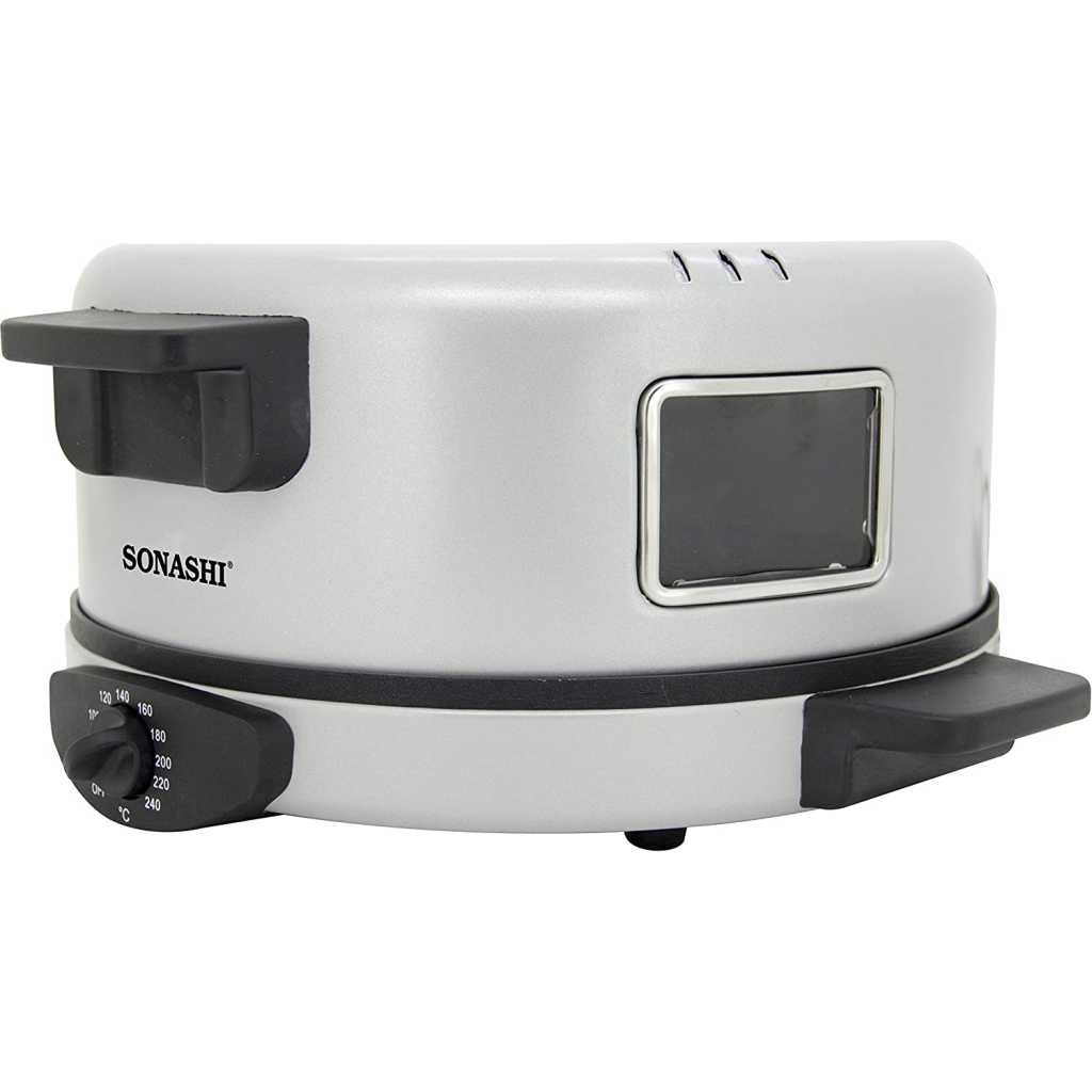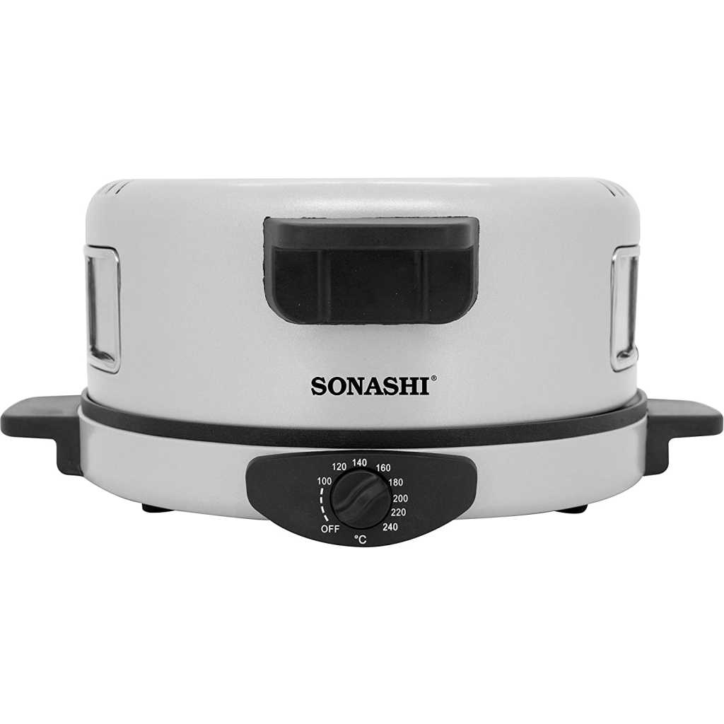 SONASHI 2-in-1 Arabic Bread & Pizza Maker SABM-863 – Stainless Steel Tube, On/Off Switch, Non-Stick Coating, Thermostat Control | 220-240 V ~ 50/60 Hz, 1800 W | Specialty Kitchen Appliances. Sonashi SABM-863 2 In 1 Arabic Bread and Pizza Maker is the tortilla maker is bolstered with a stainless-steel tube for uninterrupted usage along with non-stick coating for hassle-free cleaning. The Arabic pizza maker has cool-touch handles to prevent scalding. Make a variety of flatbreads such as Arabic bread, rotis, tortillas, pizzas, manakish, etc. without breaking a sweat. The quality pizza-bread maker by Sonashi ensures you treat guests with exotic breads, cooked to perfection. The 2-in-1 roti maker machine boasts an adjustable temperature between 180-240 degree celcius and has a switch for optimal control during cooking. This allows for fast roasting of bread so that you get just the type of crust you desire. Key Features: SONASHI 2-in-1 Arabic Bread & Pizza Maker SABM-863 – Stainless Steel Tube, On/Off Switch, Non-Stick Coating, Thermostat Control | 220-240 V ~ 50/60 Hz, 1800 W | Specialty Kitchen Appliances. 2-IN-1 ARABIC BREAD MAKER: Make a variety of flatbreads such as Arabic bread, rotis, tortillas, pizzas, manakish, etc. without breaking a sweat! The quality pizza-bread maker by SONASHI ensures you treat guests with exotic breads, cooked to perfection. HIGH QUALITY CONSTRUCTION: The tortilla maker is bolstered with a stainless-steel tube for uninterrupted usage along with non-stick coating for hassle-free cleaning. The Arabic pizza maker has cool-touch handles to prevent scalding. ADJUSTABLE TEMPERATURE: The 2-in-1 roti maker machine boasts an adjustable temperature between 180-240 ℃ and has a switch for optimal control during cooking. This allows for fast roasting of bread so that you get just the type of crust you desire. SMART DESIGN: The thoughtfully constructed pizza maker is topped with several useful features such as a viewing window to see if the cooking is progressing correctly, and a vented dome lid to get a crispy exterior every time. The red-light indicator signifies that the bread is ready! PRODUCT SPECIFICATIONS: The 2-in-1 electric bread maker runs on a voltage of 220- 240 V and has a power of 1800 W. It features a 30 cm diameter, a 2.55 mm thick die-cast cooking plate.