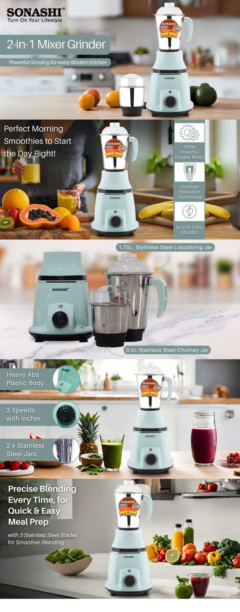 550W POWERFUL COPPER MOTOR PREMIUM QUALITY STAINLESS STEEL JARS OVERHEAT PROTECTION HEAVY ABS PLASTIC BODY 3 VARIABLE SPEED WITH INCHER 1.75L S/S LIQUIDIZING JAR 0.5L S/S CHUTNEY JAR AC 220-240V, ~ 50/60Hz 550W Key Features: 550W POWERFUL COPPER MOTOR PREMIUM QUALITY STAINLESS STEEL JARS OVERHEAT PROTECTION HEAVY ABS PLASTIC BODY 3 VARIABLE SPEED WITH INCHER 1.75L S/S LIQUIDIZING JAR 0.5L S/S CHUTNEY JAR AC 220-240V, ~ 50/60Hz 550W