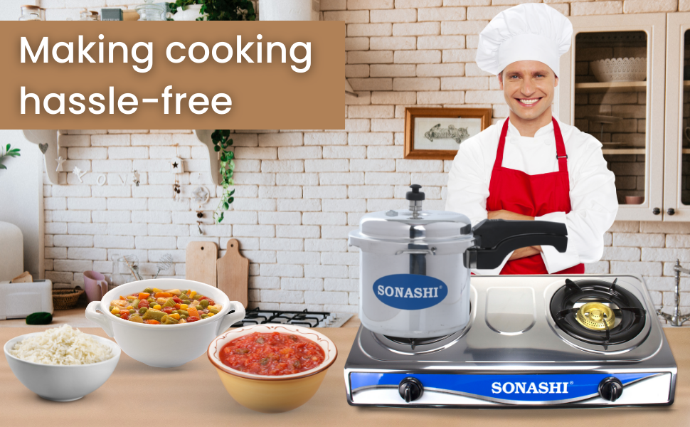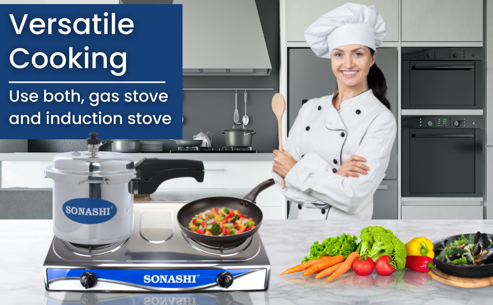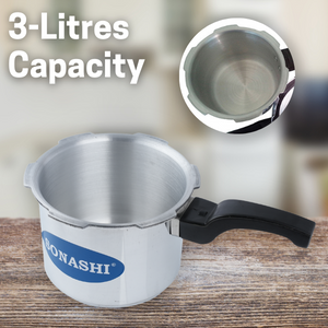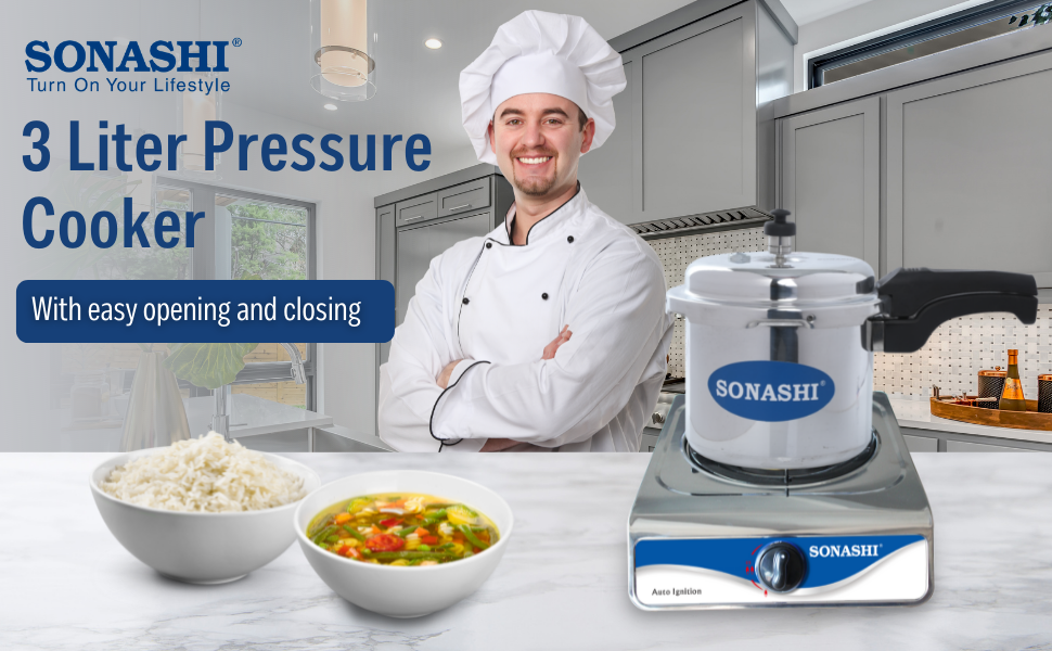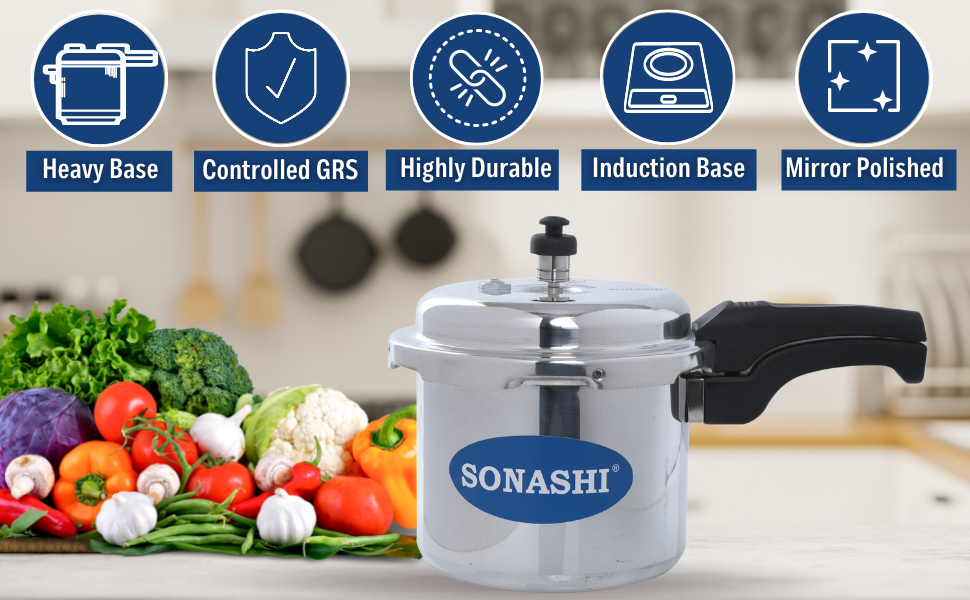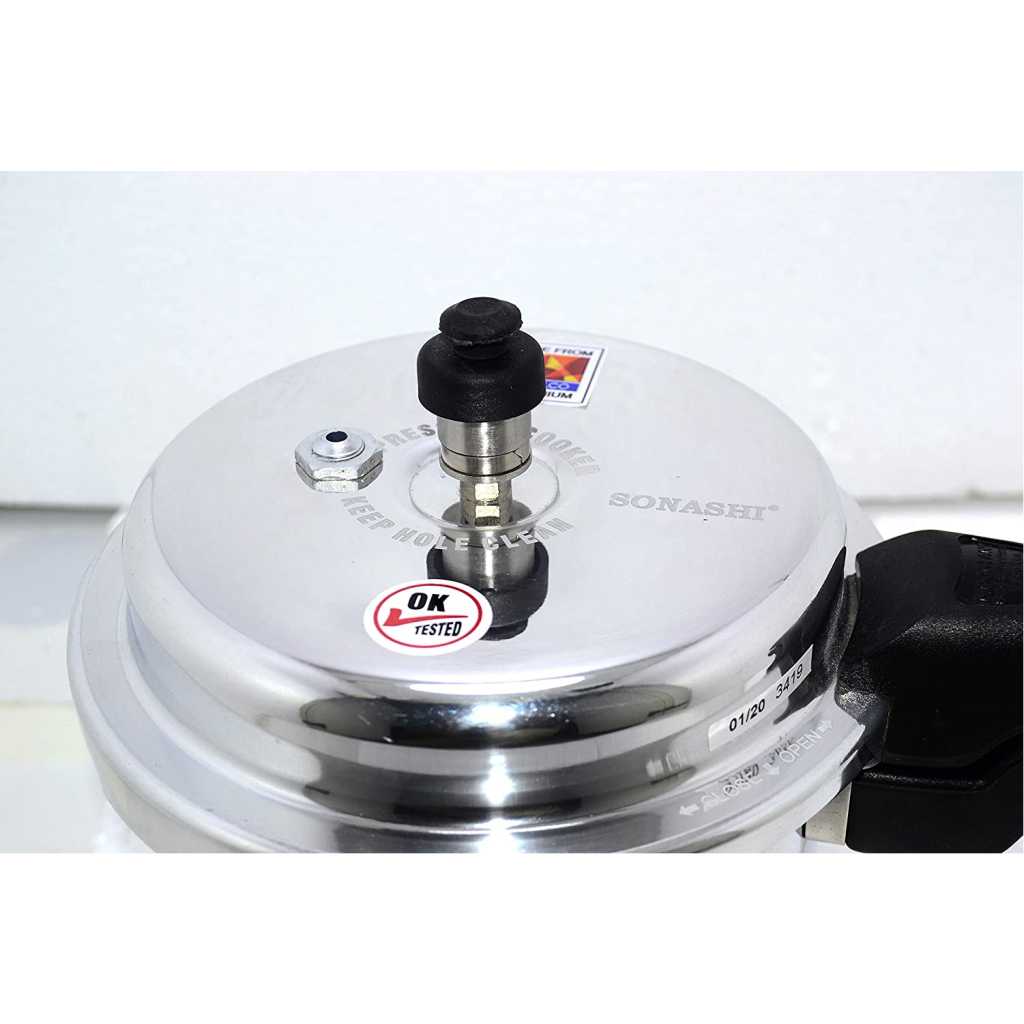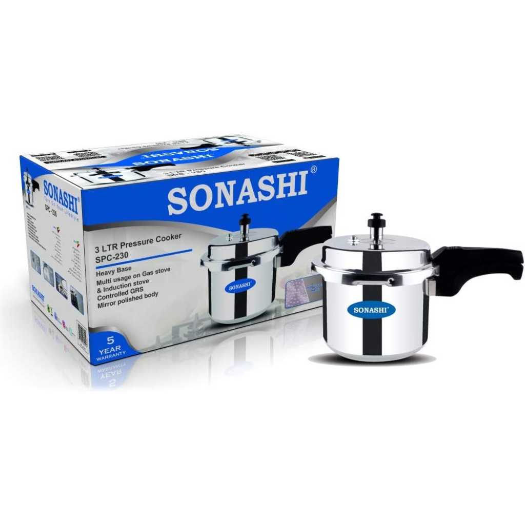 SONASHI 3L Pressure Cooker SPC-230 – Heavy-Base Aluminium Pressure Cooker with Whistling Weight Valve, Extra Strong Lugs, Mirror Polish | Home Appliances. Key Features: SONASHI 3L Pressure Cooker SPC-230 – Heavy-Base Aluminium Pressure Cooker with Whistling Weight Valve, Extra Strong Lugs, Mirror Polish | Home Appliances. Multi-Functional Use: Whether you’re in the mood for boiled veggies and rice, or a belly-warming soup, you can accomplish it all with your pressure cooker. The possibilities are as creative as you are. Highly Durable: This Sonashi cooker boasts an aluminium body that promises to withstand the test of time. It has a heavy base that makes the cooker perfect for everyday cooking. Convenient Cooking: This cooker has whistling weight valve that cooks food faster than usual, saving your time in the kitchen. It has extra-long lugs that makes it convenient to use. Simultaneous Cooking: With easy opening and closing, this pressure cooker appliance, works on both induction and gas stove. You can easily cook foods like rice, soup, and other mouth-watering delicacies. Specifications: The Sonashi 3L pressure cooker boasts an aesthetic mirror polish finish and is made out of made from virgin aluminium. It has controlled GRS that ensures maximum safety throughout.