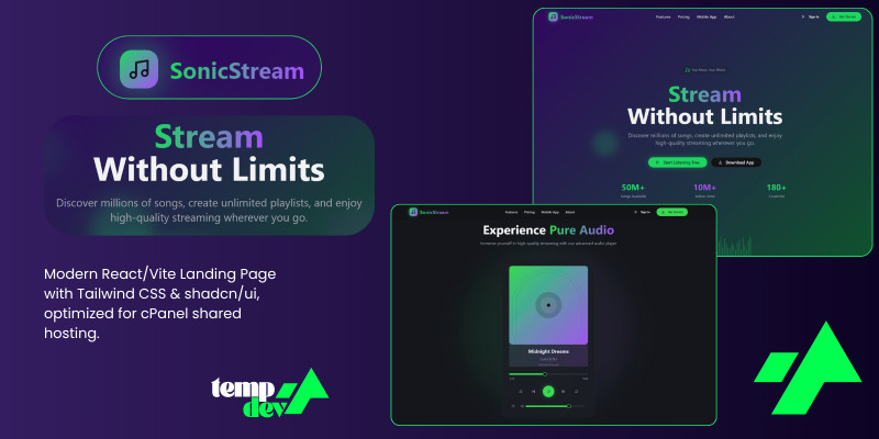 Sonic Stream. Modern React/Vite Landing Page with Tailwind CSS & shadcn/ui, optimized for cPanel shared hosting.