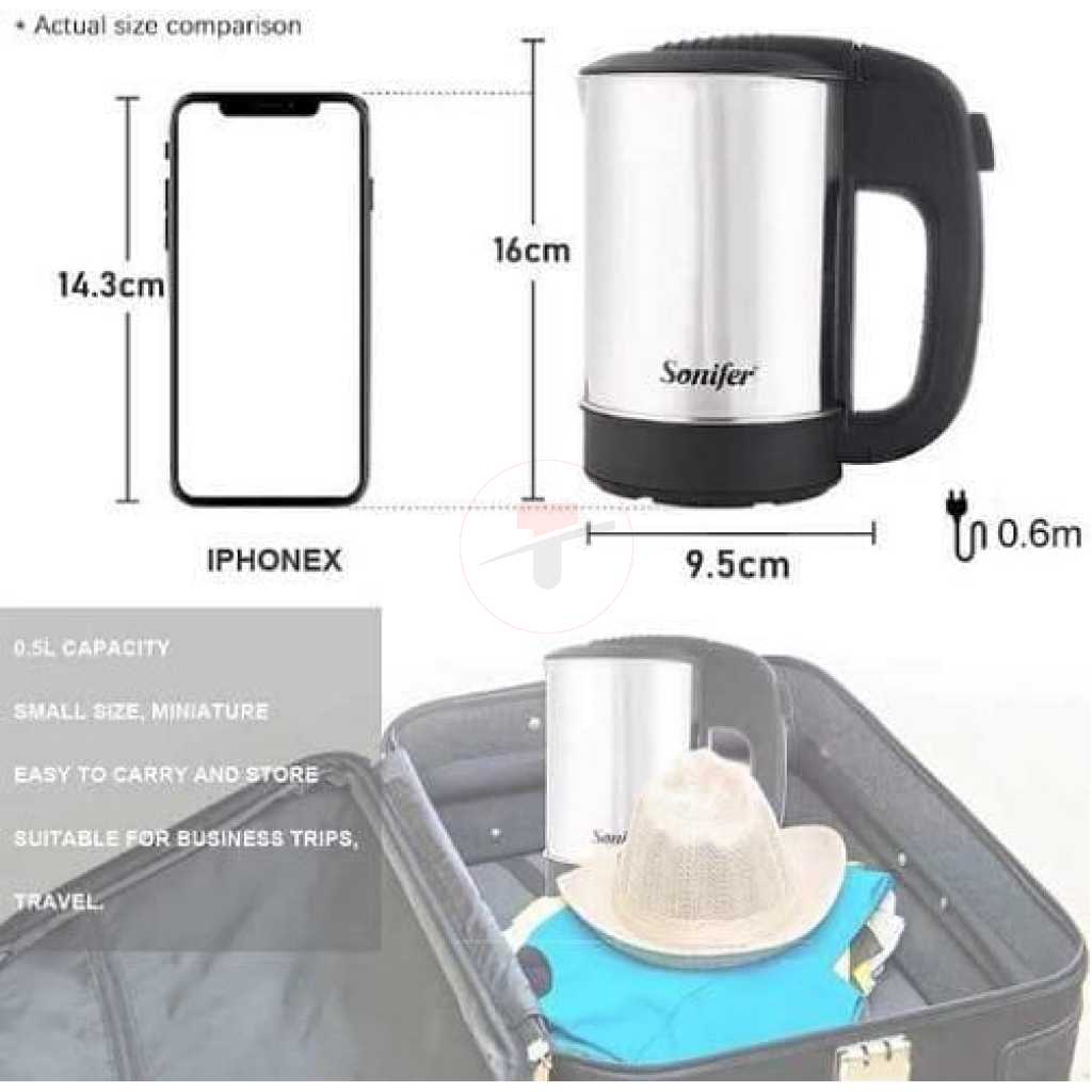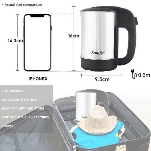 Key Features: Sonifer 0.5 Litres Stainless Steel Mini Portable Electric Kettle For Travel Hotel Office And Home- Silver Power Source: Electric Capacity: 0.5 Liter Used to boil water and make hot drinks Model no: SF-2011 stainless steel concealed heating element 360-degree connector on the power base power indicator light display the on/off button not automatic AC220-240V 50/60HZ 1000W