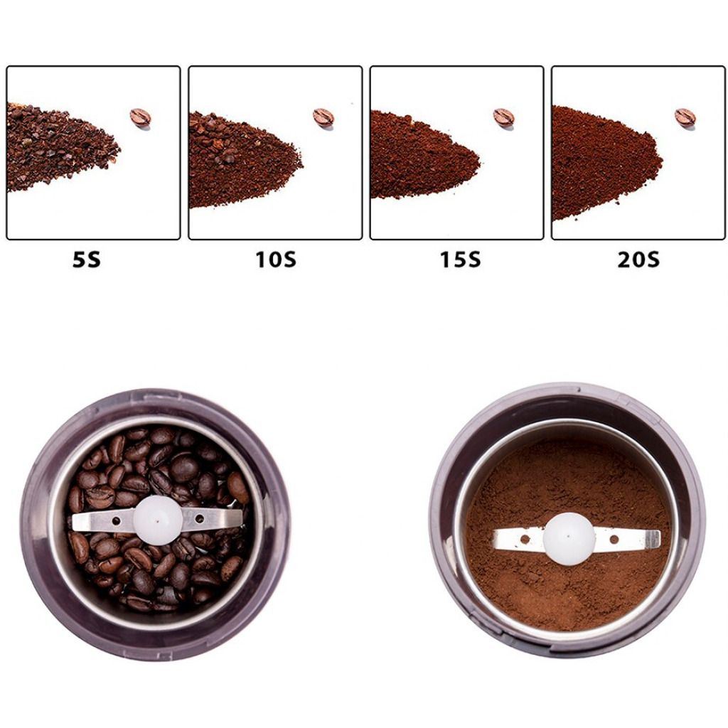 Household coffee grinder Key Features: Color: Black Very fast Product Type: Coffee Grinder Power: AC 220-240v, 50/60 Hz Capacity 50g Safety lock system Pulse operating mode Stainless steel grinding blade On/Off button for easy operation