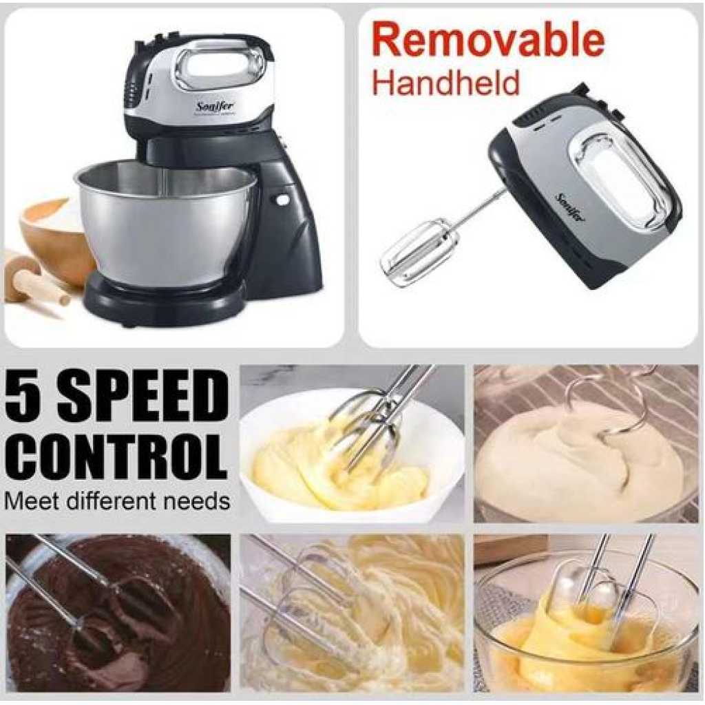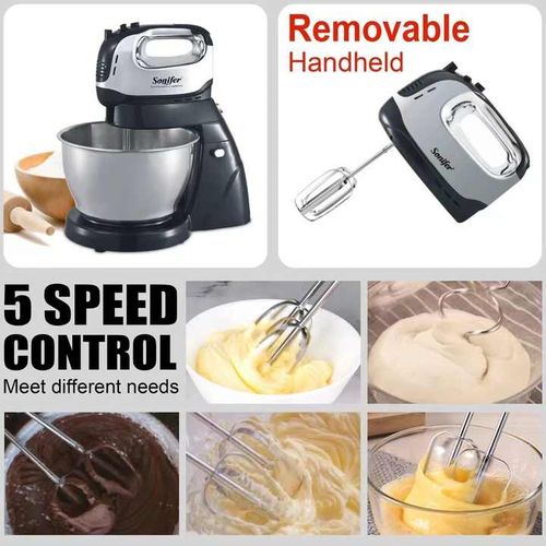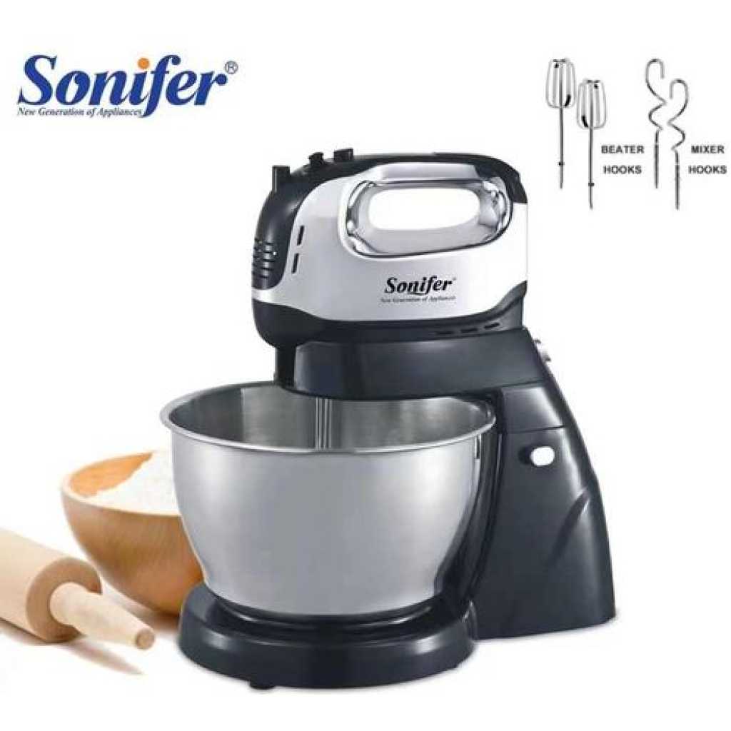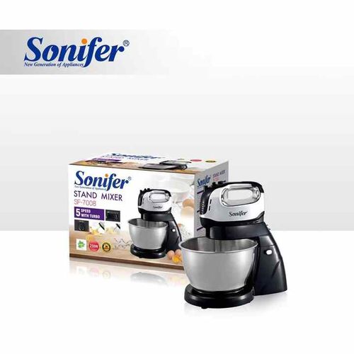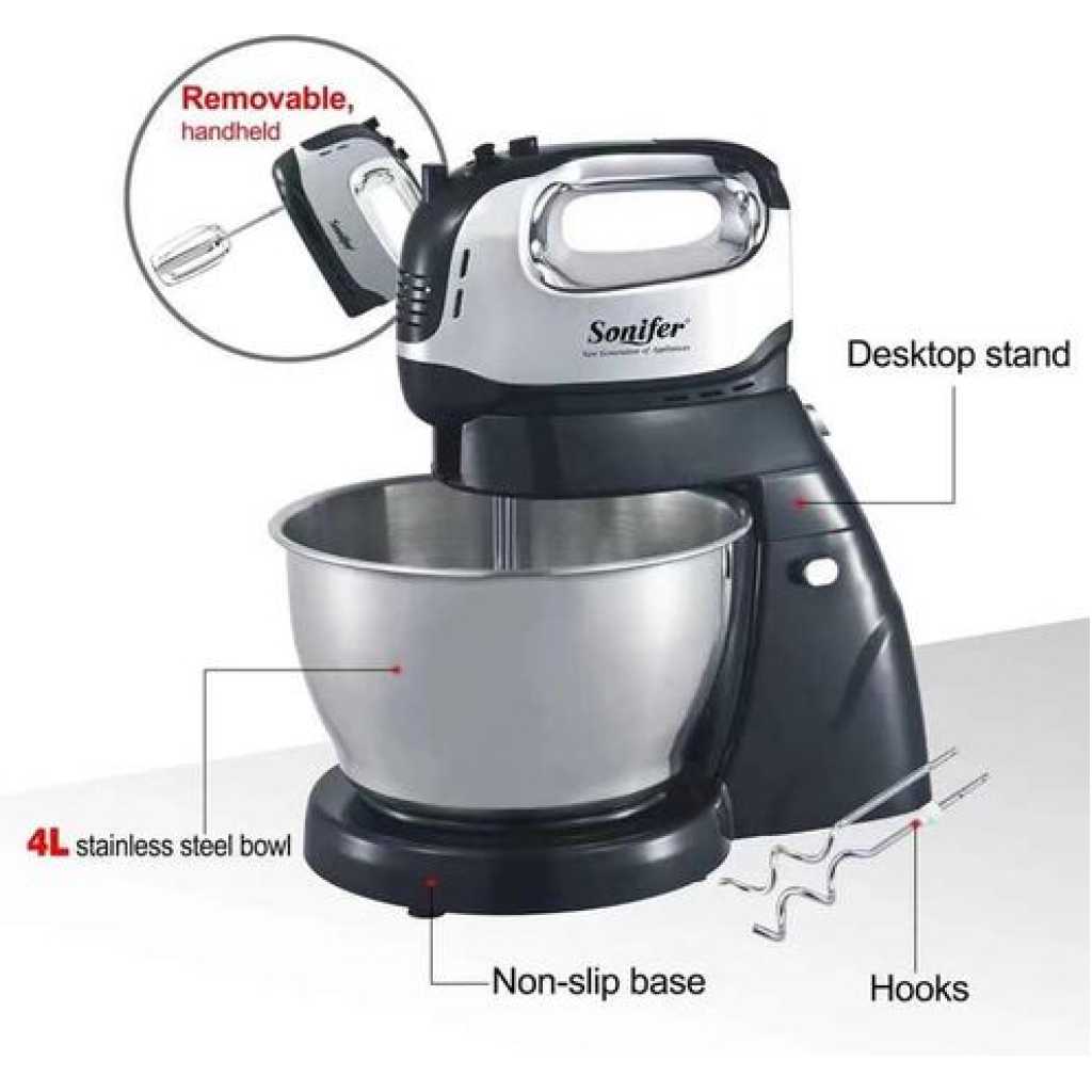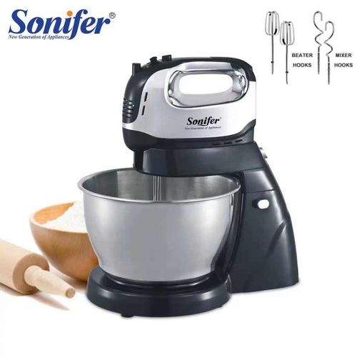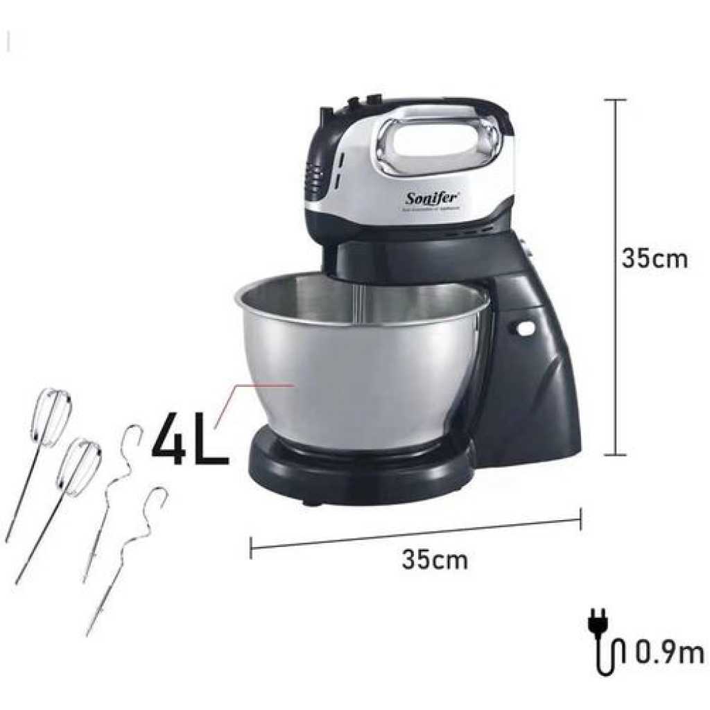 Sonifer 4L Electric Dough Hand Stand Mixer Food Processor With Bowl- Silver . The sonifer sf-7008 mixer made of durable Steel with a stand and a metal bowl is the perfect assistant in your kitchen. The stylish, reliable, practical model of the desktop mixer will help you in preparing culinary masterpieces. With a sonifer mixer, it’s easy and easy to cook mashed potatoes or beat eggs for dessert, knead the dough, or mix the minced meat with special whisks. Cook with pleasure thanks to a functional mixer in an elegant design. The mixer is located on a stand and has a convenient metal bowl with a volume of 10 liters. Not whimsical at work. The compact size does not take up much space in the kitchen. It is simple and convenient to work with such a mixer. Specifications Manufacturer: sonifer Model: SF-7008 Mixer type: Stationary Number of speeds: 6 Case material: Steel The volume of the bowl: 4. L Material of the bowl: metal The protective lid on the bowl: Yes – Voltage, V: 220 Metal Power, W: 950 Frequency, Hz: 50 Included: removable bowl, 3 nozzles: hook for kneading yeast dough, spatula for kneading liquid dough and mashed potatoes, whisk for whipping Key Features: Sonifer 4L Electric Dough Hand Stand Mixer Food Processor With Bowl- Silver . Power 950 watts Voltage :220-240V~50/60Hz Aluminum die-casting housing with UV coating; 4L brush stainless steel bowl; 6 Speed setting with pulse control; LCD display; Full metal gear system for perfect mixing results and heavy duty; Constant speed design; Tilt-back head for easy access to mixture; Removable S.S bowl for easy operation; Detachable aluminum blade for easy cleaning; Transparent splash cover; Planetary mixing action; Skid-resistant feet.
