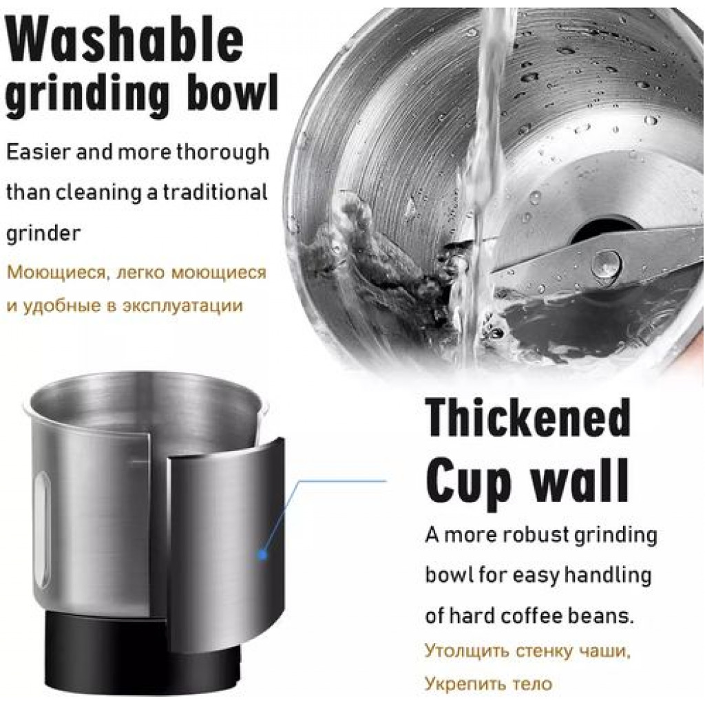 Key Features: Color: Black Very easy to use Stainless steel High quality Has unique design and classic style Used to grind coffee, sugar, nuts and spices 50-100g Capacity 160Watt Motor Excellent speed to ensure grinding smoothness in minutes Can be operated easily Cover is made of transparent glass Made of stainless mill