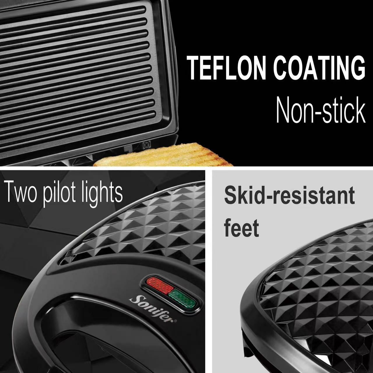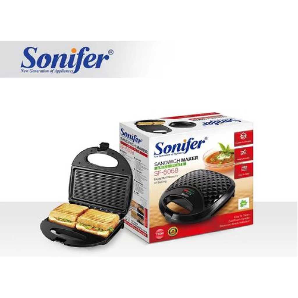 Key Features: Brand: Sonifer Color: Black Type: Sandwich Maker Package weight in KGs: 1.4KG Model Number: SF-6068 Wattage: 750 Watt product descraption: Easy to use Quick to prepare Cool touch housing,Non-stick coated plates,Indicator light Material : Plastic+Metal Interchangeable Plates : Grilling Panini Press Plates Easy to use and store Helps you organize your kitchen