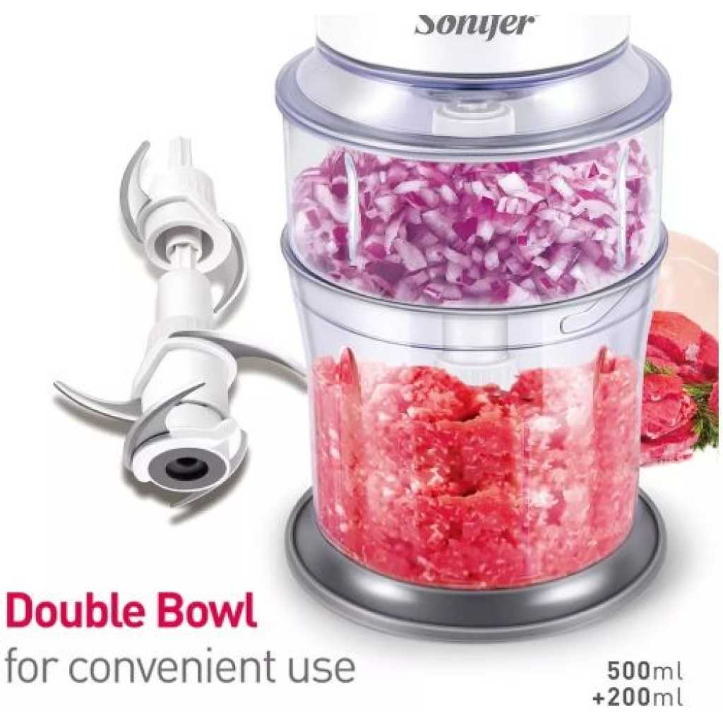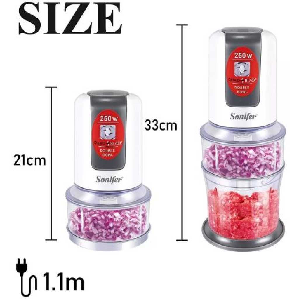 Key Features: Sonifer Multi-functional Electric Food Processor Chopper Spiral Meat Grinder Fruit Shredder Slicer- Clear. Capacity:1.2L Jar Voltage (V): 220-240V Elegant design Overheat protection Multifunction: mixing, blending, chopping 2 stainless steel blades Plastic cream attachment AC220-250V 50/60Hz 200W