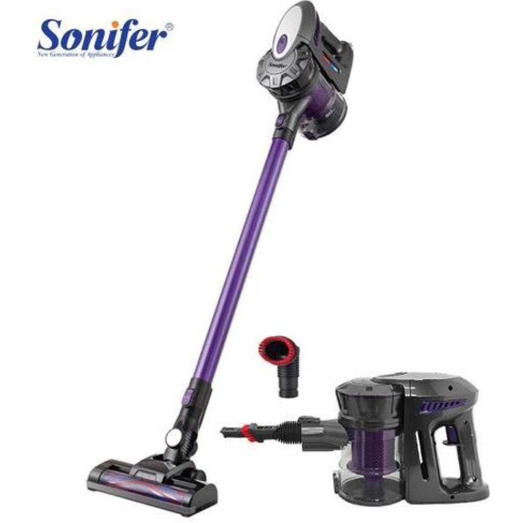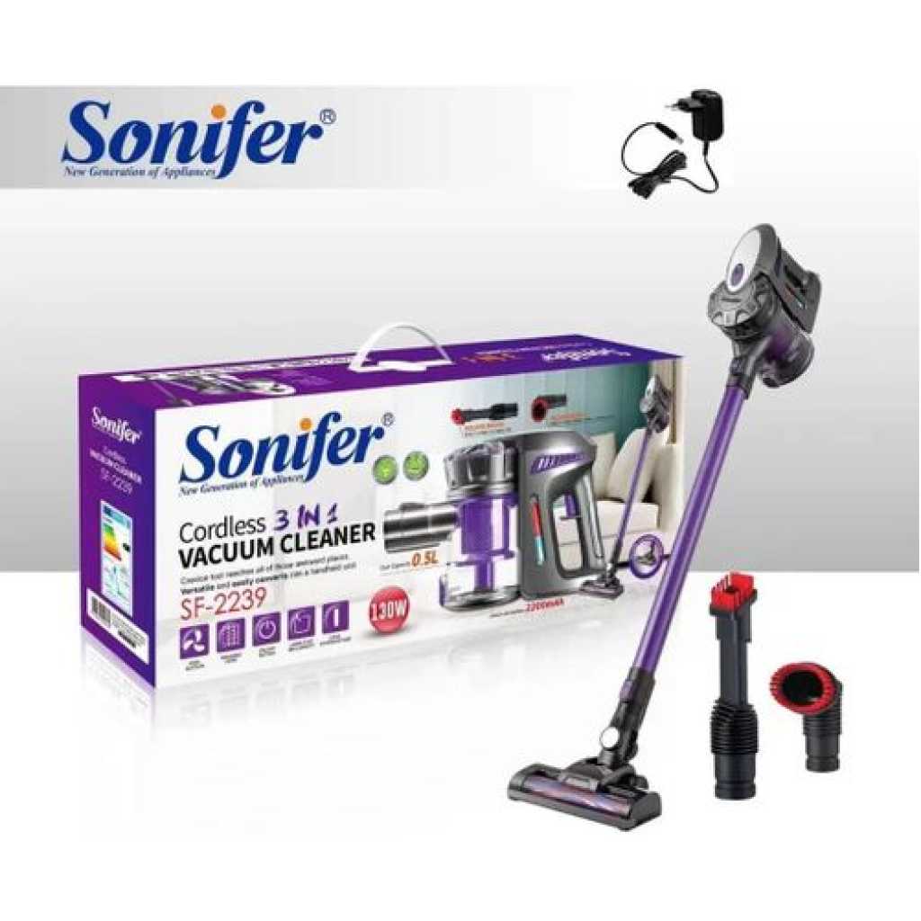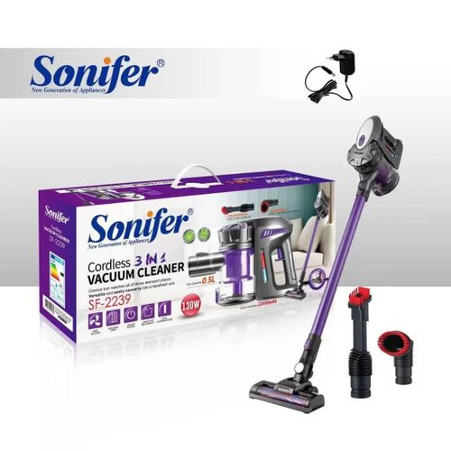 Description 130W 2200mAh 500ml 3 IN 1 Rechargeable Cordless Handheld Vacuum Cleaner SF-2239 Features: Long-lasting 2200mAh Lithium Ion battery High/ Low two-speed settings Washable filter Crevice tool reaches all of those awkward places Versatile and easily converts into a handheld unit Square Brush: easy to clean car gaps, etc. Round brush: easy to clean beds, sofas, curtains, etc. Flat floor brush for hard floors & carpets ON/ OFF button Large dust bin capacity Long extension tube Specifications: Brand: Sonifer Model: SF-2239 Battery Type: Lithium Ion Battery: 2200 mAh Power: 130W Dust Capacity: 0.5L Voltage 220-240V Frequency: 50-60Hz Charging time: 4-5 Hours Operating time:17-35 Min Speed: 2 Settings (High/ Low) Washable Filter Size: (L115 x W23 x H23)cm Package Included: 1 x Vacuum Cleaner 1 x Extension Tube 1 x Floor Brush 1 x Square Brush 1 x Round Brush 1 x Power Adapter 1 x User Manual Key Features: ★3-in-1 versatile : Easily switch to a handheld at the touch of a button.It can be help cleaning of upholstery, stairs, and other hard-to-reach spots. ★Multifunctional:Applied to all floor types like hardwood and hard floor, quickly changes to hand held, fast sweep the dogs hair and the dirt on sofa, stairs, wall. ★Exhaust system,with temperature control protection,effective secondary filtration.Easy to clean,Dust cup,filter, filter element can be washed with water. ★The 1.2L dust cup holds more dirt and requires less frequent emptying between uses. Hygienic bin emptying – no need to touch the dirt.Clean more, empty less. ★5 m power cord,no need to change the socket frequently.Silent design, providing more efficient cleaning effect.
