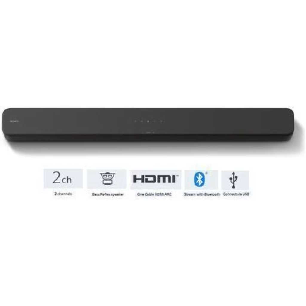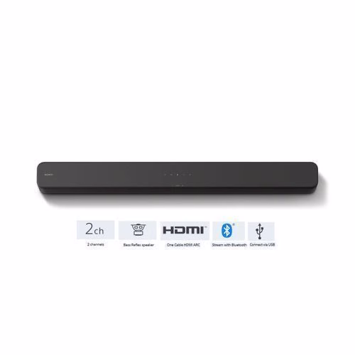 SONY 2 channel Single Sound bar with Bluetooth® technology – HT-S100F Perfectly designed for entertainment Enjoy your favourite TV shows in enhanced sound quality delivered by this 2 channel sound bar with a Bass Reflex speaker. The HT-S100F’s slim profile design fits easily in your home and sits comfortably within any interiors. 2 channels The two speaker setup delivers front surround sound from a compact unit. Bass Reflex Speaker A speaker that delivers punchy bass without compromising detail and clarity, perfect for enjoying TV shows and music. Perfect pairing and simple connectivity with your TV Connecting to your TV has never been easier. With HDMI ARC, one cable gives an easy connection for all your TV audio. You can control both with just one remote. One Cable HDMI ARC Send audio and control information from your TV using just one cable with HDMI ARC. Hear sound come from all around Our virtual surround sound technology puts you right at the heart of the movies you love by emulating cinema style surround sound. Stream with Bluetooth® technology Stream music wirelessly with Bluetooth® technology. Connect via USB Plug in via USB to play back your favourite albums. Key Features: Sony 2 Channel SoundBar with Bluetooth HT-S100F – Black Deep sound with Bass Reflex speaker Compact, space saving design Easy TV set up with HDMI ARC High sound quality from S-Force Front Surround Music play back with USB and Bluetooth®