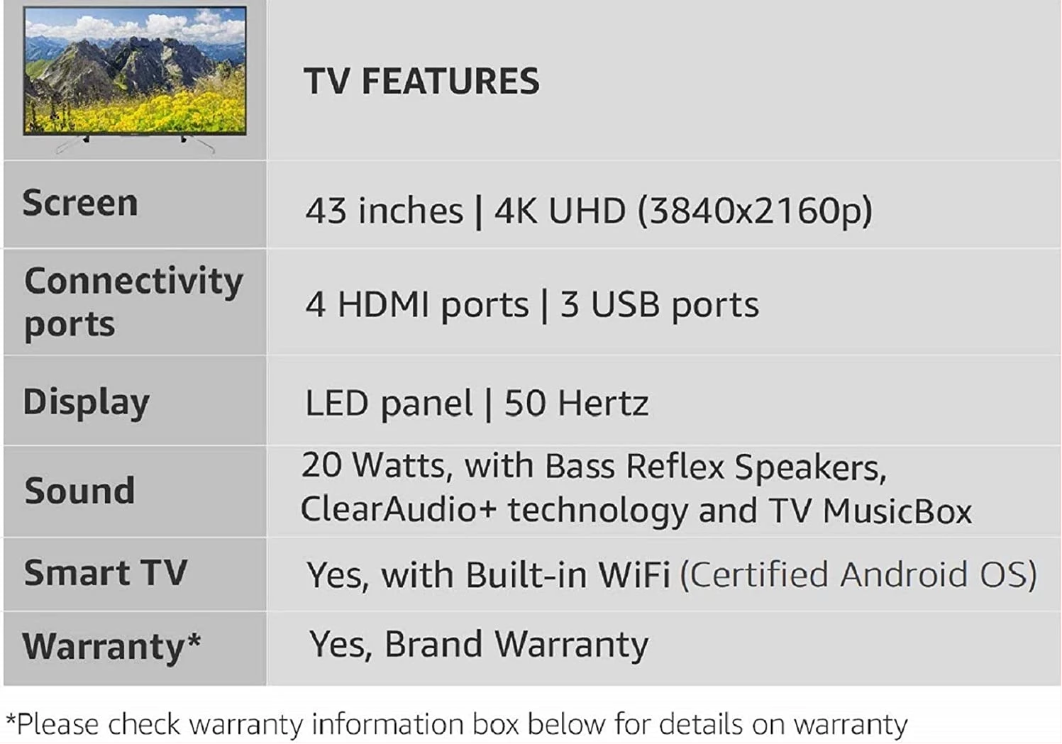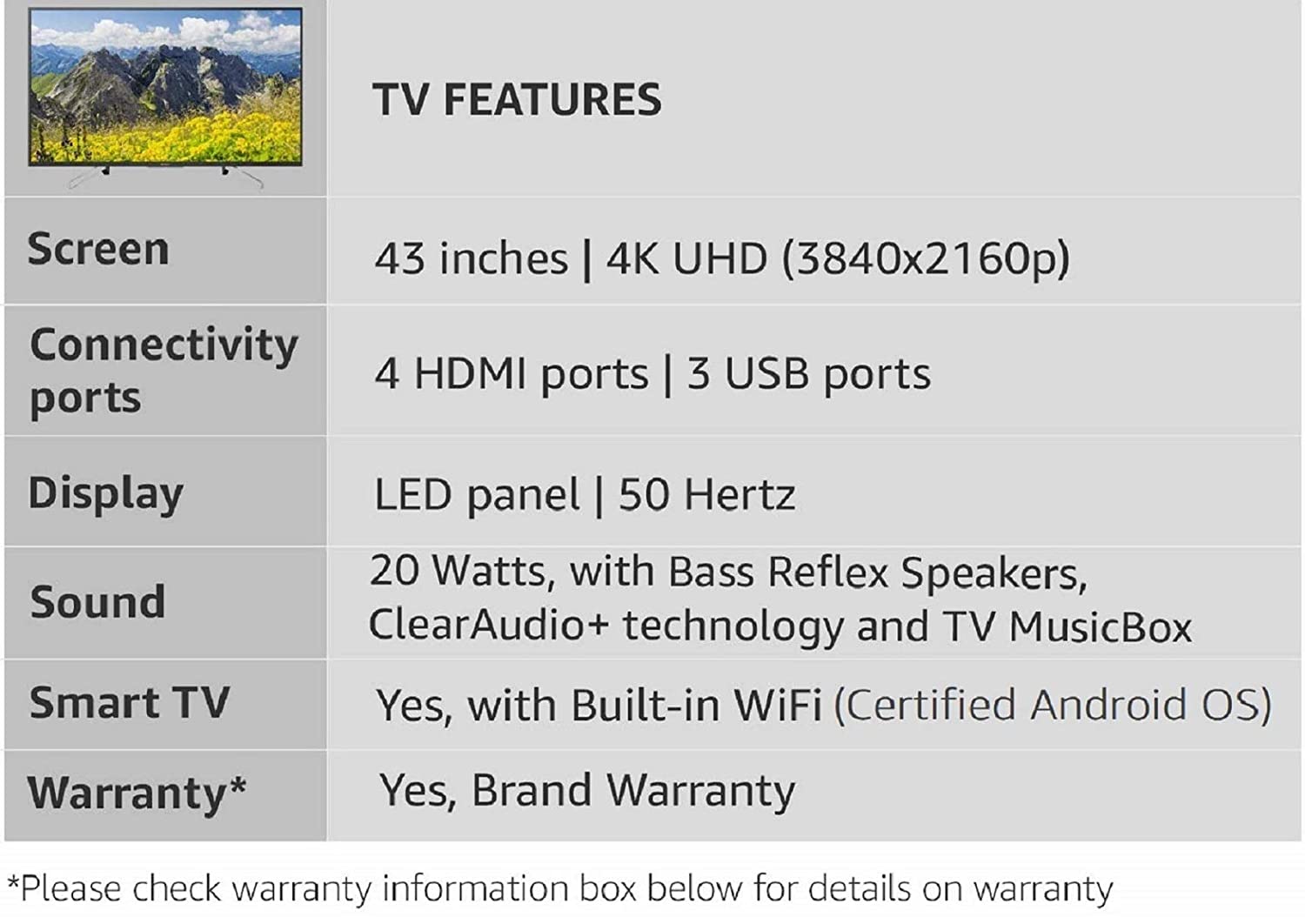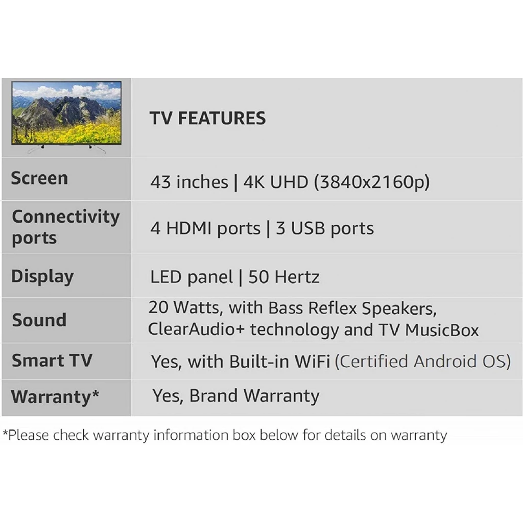 Sony 43 Inches 4K Ultra HD Certified Android LED TV KD-43X7500F (Black) Key Features: Sony 43 Inches 4K Ultra HD Certified Android LED TV KD-43X7500F (Black) Resolution: 4K UHD (3840 x 2160) | Refresh Rate: 50 hertz Connectivity: 4 HDMI ports to connect set top box, Blu Ray players, gaming console | 3 USB ports to connect hard drives and other USB devices Sound output: 20 Watts Output | Bass Reflex Speakers | ClearAudio+ technology | TV MusicBox Smart TV Features: Android TV | Voice Search | Google Play | Chromecast | Recommended by Netflix Display: 4K HDR | 4K X-Reality Pro | Motionflow XR | BACKLIGHT DIMMING TYPE: Frame Dimming Installation: For installation/wall mounting/demo of this product once delivered, directly contact Sony at 18001037799 and provide product’s model name and seller’s details mentioned on your invoice. The service center will allot you a convenient slot for the service 1 year comprehensive warranty by Sony from date of purchase Additional Information : X-Protection Pro | IR Blaster Easy returns: This product is eligible for replacement within 10 days of delivery in case of any product defects, damage or features not matching the description provided