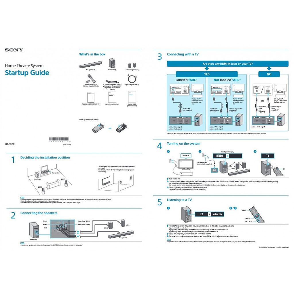 Key Features: Sony HT-S20R Real 5.1ch Dolby Digital Soundbar for TV with subwoofer and Compact Rear Speakers, 5.1ch Home Theatre System (400W,Bluetooth & USB Connectivity, HDMI & Optical connectivity) Dolby Audio : Enjoy dramatic, high-quality surround sound from 5.1 separate audio channels with Dolby Digital 5.1ch Surround Sound : 5.1 channels of real surround sound. Rear speakers and an external subwoofer work with a 3-ch soundbar to deliver dynamic, immersive, cinematic sound. Power Output : 400W power output puts you right at the heart of action. HDMI CEC : Yes Bluetooth Connectivity : Easily play your favourite content via bluetooth connectivity USB Playback :Use the USB port to plug and play music from a memory stick with ease Sound Mode :A button for every sound—choose the mode that’s right for whatever you’re watching or listening to, including Auto, Standard, Cinema and Music. You can also select Night and Voice modes HDMI Arc and Optical Connectivity : Connect your soundbar with TV via single cable connection