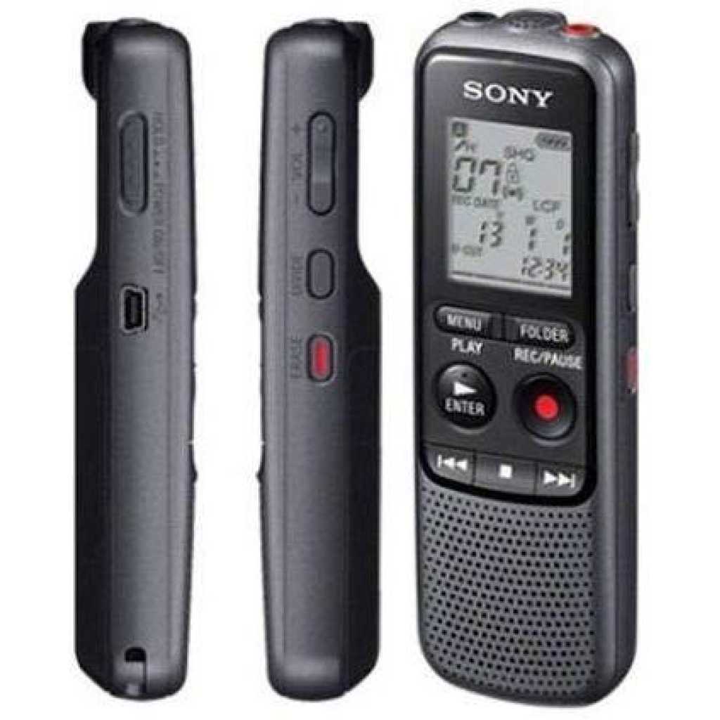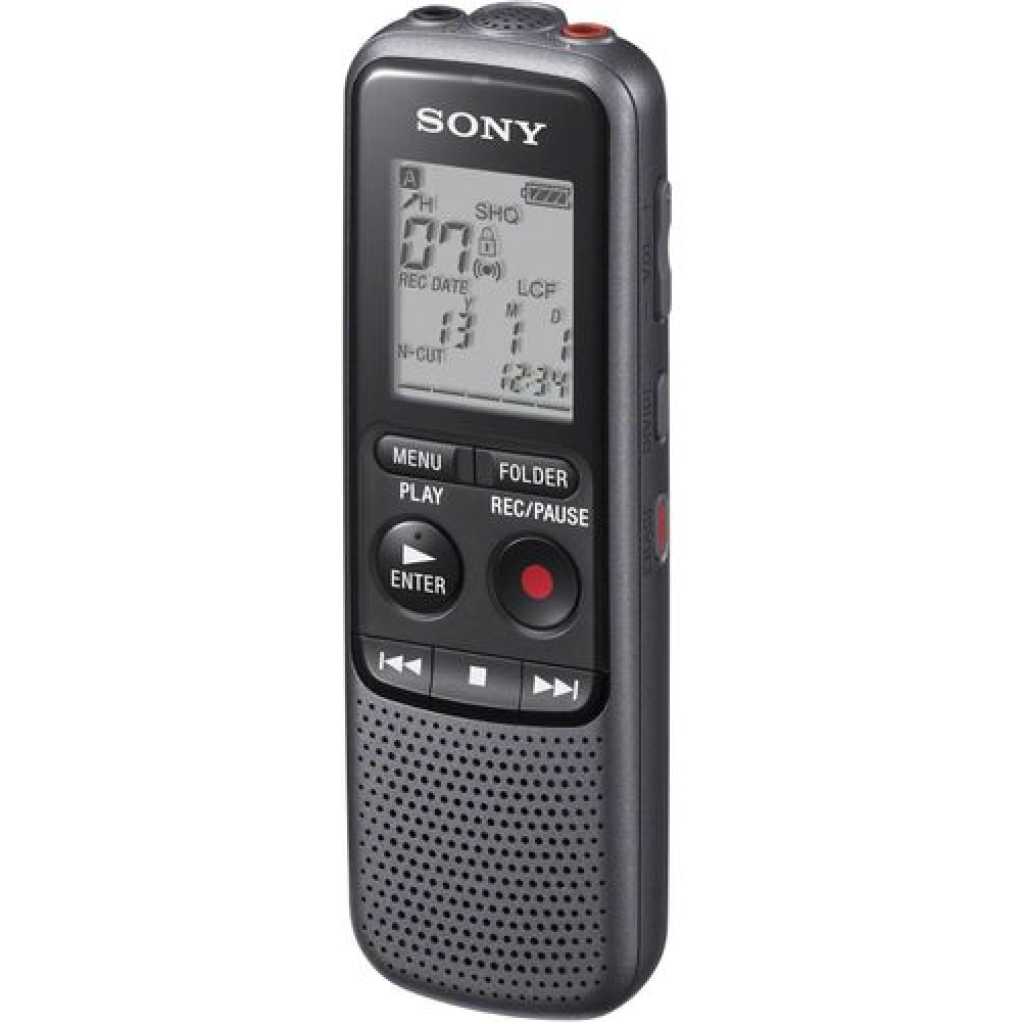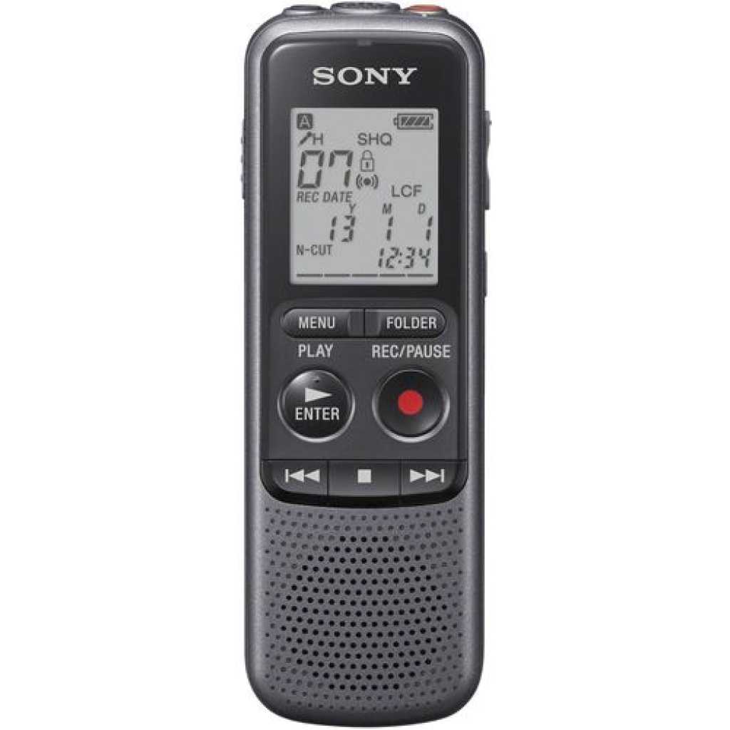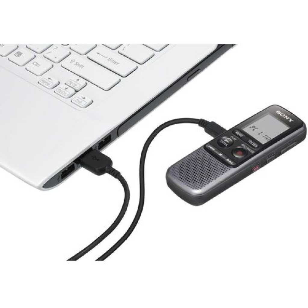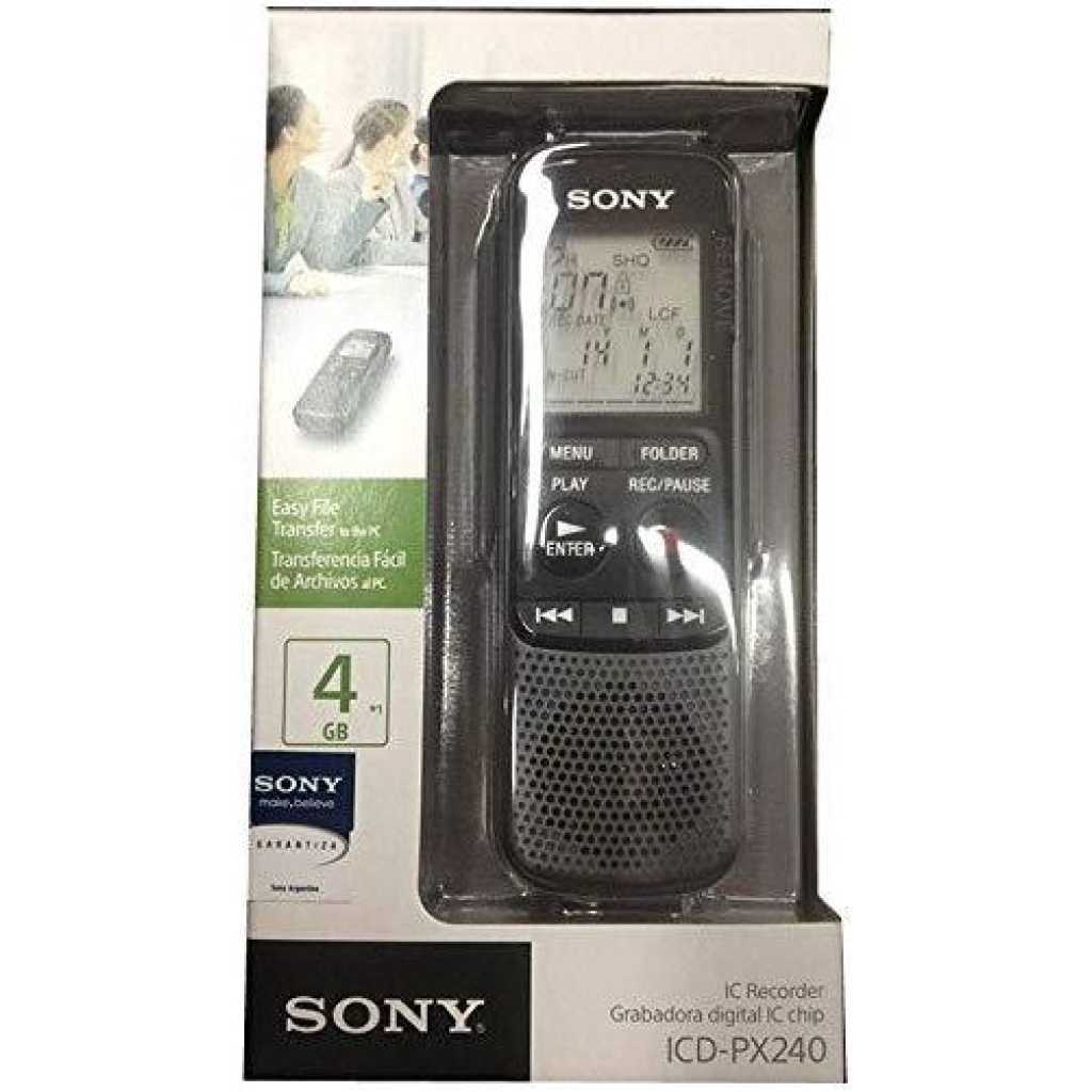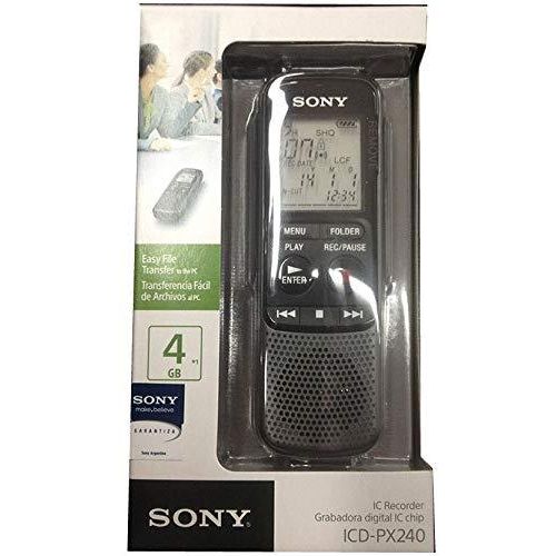 Sony ICD-PX240 4GB Digital Voice Recorder Now you can transfer your voice recordings to your computer with the Sony ICDPX240 digital recorder! With this recorder you won’t miss a detail and you can also use it to listen to your recordings whenever you like. Features: 4 GB memory Voice-operated recording (VOR)Playback speed control Noise cutch display Hold function Compatible with Windows and Mac Whether you’re recording an interview or a lecture, the Sony ICD-PX240 Digital Voice Recorder helps you to accurately capture audio. Plenty of recording space The ICD-PX240 lets you capture MP3 recordings, which can be played back using the 300 mW speaker. With 4 GB of memory built in, you’ll be able to record up to 1043 hours of audio. You have options to organize, protect and delete files and folders on the recorder to keep your recordings organized with this convenient Dict-aphone. Record for longer The ICDPX240 is powered by two AAA batteries, and a long battery life of up to 32 hours means you’ll be able to record plenty of audio before you’ll need to change the batteries. Perfect for study or work, the Sony ICD-PX240 Digital Voice Recorder provides a reliable way to record audio. Now you can transfer your voice recordings to your computer with the Sony ICDPX240 digital recorder! With this recorder you won’t miss a detail and you can also use it to listen to your recordings whenever you like. Features: 4 GB memory Voice-operated recording (VOR)Playback speed control Noise cutch display Hold function Compatible with Windows and Mac OS Speaker power: 300 headphone output Microphone outputs cable included Battery-operated (2 x AAA, included)Approx. dimensions: 4 x 11 x 1. 5 cm Key Features: Sony ICD-PX240 4GB Digital Voice Recorder Built-in 4 GB flash memory – Up to 1,073 Hours of maximum recording time with Added Time on External Memory Card Stereo Microphone for 75 – 15 kHz audio response With Intelligent Noise Cut for noise-free recordings Add and Overwrite function for fast and easy editing on the go Complete Combination of Accessories to Get Optimum Function USB Cable, Batteries and User Manual Included with the Recorder other Accessories Mentioned Are Additions