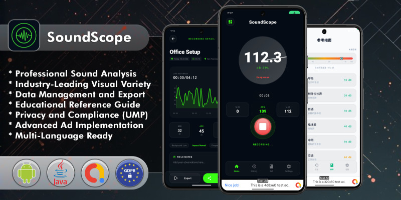 SoundScope - Android App Template. Professional Decibel Meter & Acoustic Analysis Suite (40 Gauge Styles)
