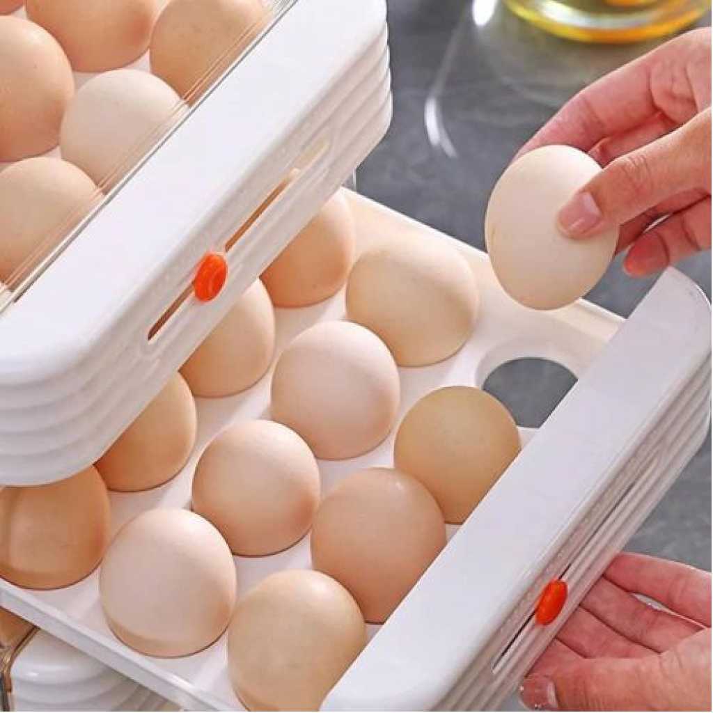 Space Saving Multifunctional 2-Layer Stackable Refrigerator Egg Tray Storage Organizer With Data Slider 32 Grids Drawer Type Egg Holder BPA Free Clear Plastic Fridge Storage Bin Clear Fresh Storage Bo