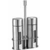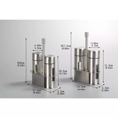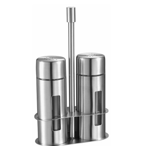 Key Features: Shaker height: 4.5″ Shaker diameter: 1.5″ Product Type: Salt and Pepper Shaker Set Primary Material: Stainless Steel Viewing window to see salt or pepper levels Capacity: 10 Oz Lids marked with S and P Easy to screw off lids