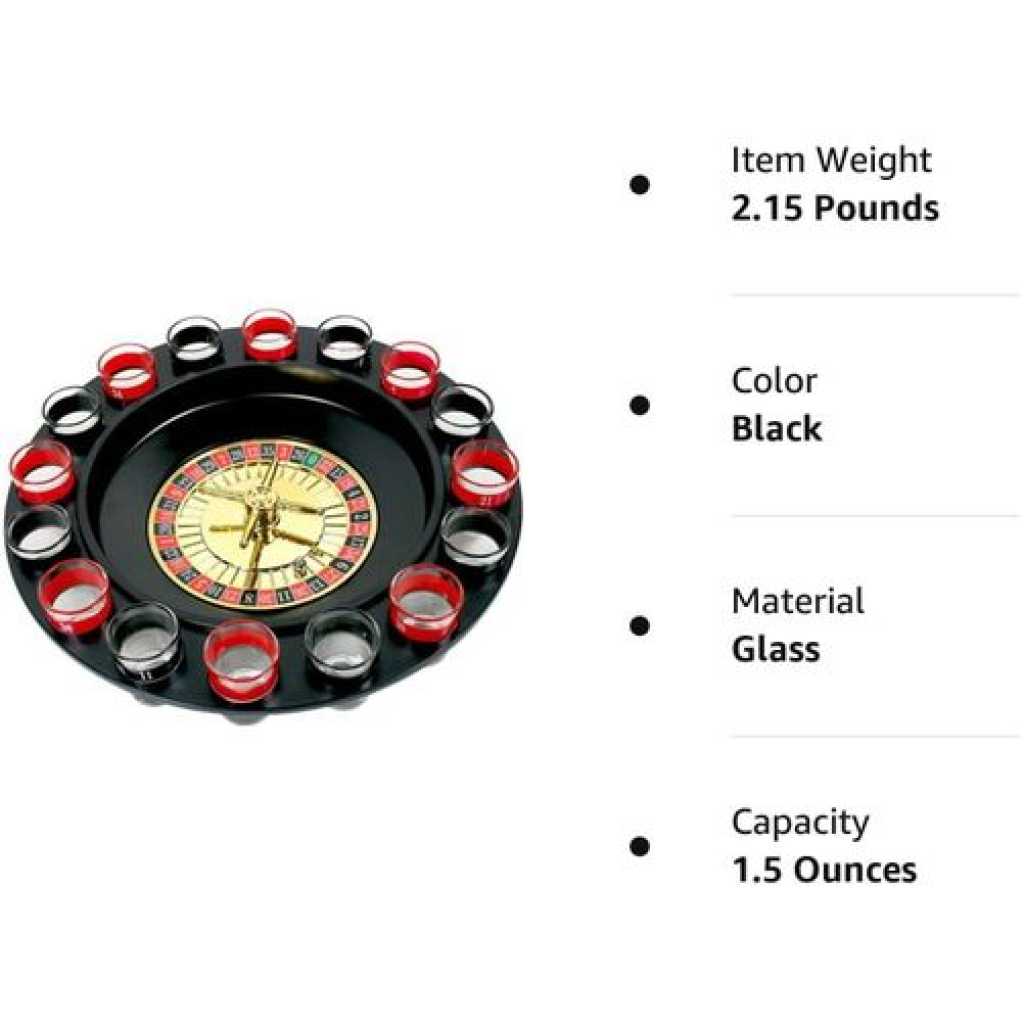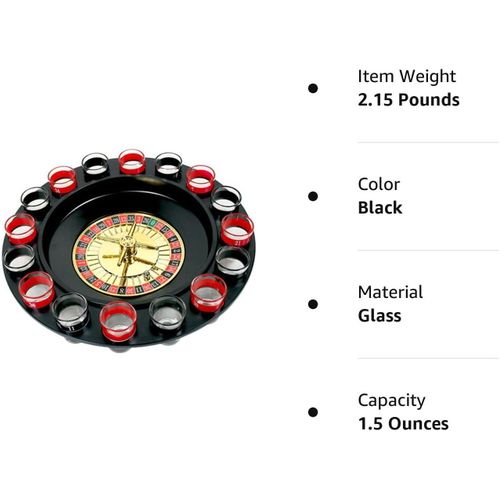 Spin Wheel Roulette Set with Ball Fun Game Set (2 Balls and 16 Glasses) Casino Style Drinking Party Game -Multicolor Shot Roulette combines every gentleman’s favorite two pastimes, drinking and gambling, in one exhilarating game. Shot Roulette is the perfect way to spend the evening with your mates; just add the alcoholic beverages of your choice. Shot Roulette contains a roulette wheel, two roulette balls, and 16 numbered shot glasses. To play Shot Roulette; simply fill each of the shot glasses, spin the wheel, and drop one of the roulette balls onto the wheel as it’s spinning. When the ball lands on a number the corresponding shot must be taken. If the glass is already empty, the player misses a turn. The game is over once all the shots have been taken. To make Shot Roulette more interesting you can vary the levels and contents of each glass or even use both roulette balls so two shots have to be taken on each turn! Please ensure alcohol is enjoyed responsibly. Shot Roulette is part of the Gentleman’s Club range – a range of accessories to help today’s young gentleman find his way in society. This is an authentic working casino-style roulette wheel made of durable high-impact plastic. Features: Contains 16 numbered shot glasses Great for parties and stag do’s Looks like a real roulette wheel Easy gameplay Part of the Gentleman’s Club range For 2 to 8 players Measurement: 30cm Diameter Key Features: Spin Wheel Roulette Set with Ball Fun Game Set (2 Balls and 16 Glasses) Casino Style Drinking Party Game -Multicolor Lucky Shot Glass Roulette – Drinking Game Set – 12 inches diameter The drinking games set includes a spinning roulette wheel, two balls, and 16 numbered glass shot glasses To play, simply turn the wheel to see whose number is up. If your shot glass corresponds to the number played, empty the glass and spin it again! Go ahead, play the fun and exciting game of drinking roulette no matter what number the ball lands on, everyone wins in this fun-drinking game of chance!